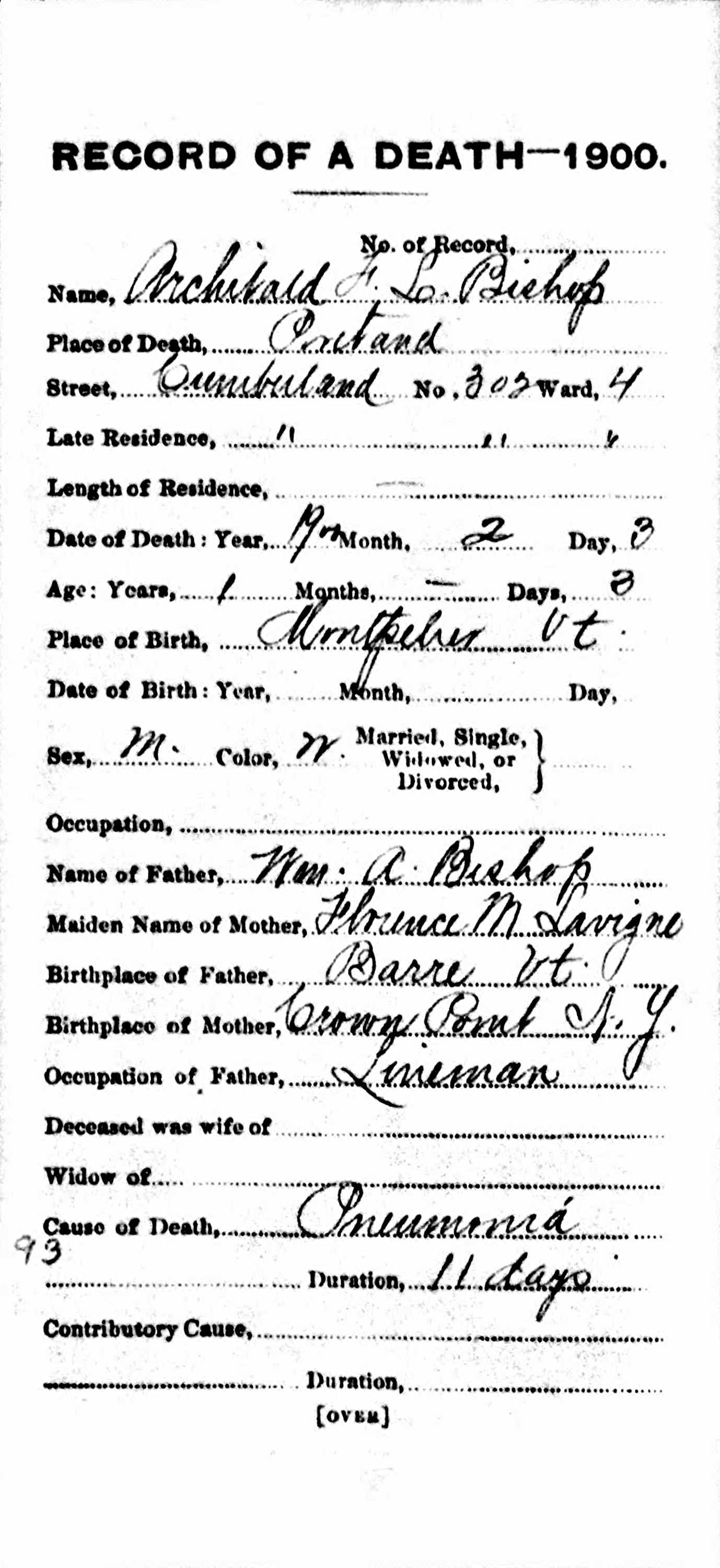 Archibald F. L. Bishop died from Pneumonia, February 3, 1900, in Portland, Cumberland Co., ME, at age 1 Year and 3 Days.