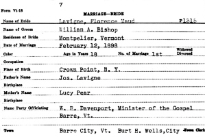 William Alger Bishop (age 19), a bachelor, and Florence Maud Lavigne (age 18), a maiden, were married February 12, 1898, in Barre, Washington Co., VT.