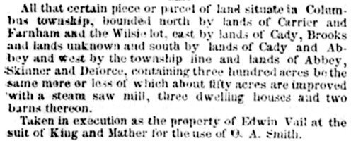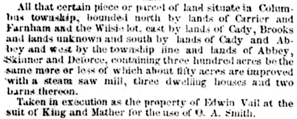 John and Holam Vail were natives of Otsego county, this state. At an early day their father with his family emigrated to Alexander, Genesee county, where he engaged in mill-wright work. He had been a person of large property, but through indorsing for others and an unfortunate contract in building a mill, he had lost nearly all he had. He was regarded as being a first class workman in every respect at the millwright business, and found no difficulty in obtaining employment in his new location. Both his sons, John and Holam, worked for him for three or four years after settling at Alexander, but after a while John became restless and left the parental roof. He found his way to Sackett's Harbor on Lake Ontario, where he engaged as a ship carpenter through the winter, sailing on Lake Ontario through the season of navigation. He continued this for several years, until he was quite competent at ship building, and capable of commanding a vessel. During the time he was at Sackett's Harbor he became acquainted with Miss Panama Fuller, daughter of Capt. Fuller, who commanded a government schooner during the war that had closed a few years previous to that period. Holam Vail continued to reside at Alexander and was employed at mill-wright work with his father. While there he became acquainted with Mary Buxton and married her in the fall of 1823. Early the next spring he concluded to find a new location where his services would be in greater demand or where he could branch out for himself. Early in April he found his way to this locality, his wife coming in June following. His first employment was in repairing the Fayette Mills for Platt & Levi Rogers. Shortly after this he purchased the site and water power where G. L. Weeks' grist mill now stands and engaged in building for himself a sawmill. At that time there was a large amount of all different varieties of timber, especially whitewood, black walnut, cherry and oak, and a good demand for sawed lumber. In the spring of 1826 he had his mill in complete running order. His brother had come over from the lower lake and settled here the fall before, and finally talked Holam into building a schooner. This was commenced the first week in May, 1826, and was launched the last of September of the same year. This vessel was called the Victory and was the first that was ever built here. She was for that time a medium sized vessel (about 125 tons burden,) but now would be regarded as little more than a yacht. The ship yard was located on the east bank of the creek near where Charles Hammon now resides. There were several vessels built on the same ground subsequently, all of which were launched into the creek. A channel had to be excavated to let them into the lake. Although the Victory was launched the last week in September, she was not fully fitted out until the next spring. In building the Victory Mr. V. had been compelled to get into debt to a considerable extent, and in order to fit out his schooner completely he was obliged to place a mortgage upon it, hoping that if he met with good success he would in a couple of years be able to liquidate and settle up. But fortune frowned upon him, as it had done to several others of this locality who had attempted to accumulate property by the aid of a sailing vessel. After two seasons of varied success, neither of which was very encouraging, Mr. Vail was compelled to succumb, and the schooner Victory, which had cost him considerable money and a large amount of hard labor, became the property of other parties. Mr. Vail was not left entirely penniless, for he still had his sawmill. Although it was somewhat encumbered, it proved a source of considerable profit to him. There was a good demand for lumber, and the surrounding country supplied him with plenty of logs for sawing. When his time was not required at his mill, he found plenty of employment at mill-wright work at prices that were quite remunerative. It was but three or four years after the loss of his schooner Victory before he was in quite comfortable circumstances again. In the summer of 1834 he met with quite a serious accident, which, for a time caused great apprehension that he might be deprived of his eye-sight and become totally blind. In addition to mill-wright work he sometimes worked as a machinist and at the time specified he was engaged in constructing a turning lathe for Luther Heaton and while on some part of this work a small bit of steel about the shape of a flax seed, but not quite so large, flew from the shaft on which he was at work and lodged in the center of the eyeball. There was no physician here that had instruments suitable for extracting it, nor could one be found in Fredonia or Westfield that dared to attempt it. Soon inflammation set in and it became so painful that his attending physician was compelled to keep him under the influence of powerful narcotics some some time. The eyeball finally decayed and ran out. The sight, from sympathy of the other eye, was sensibly affected for some time. Also his general health was seriously impaired for some time, but during the following winter he reenperated so that early the next spring (1835), he purchased from Lyman Howard, Esq., the lot and erected the house where Miss Maria Mixer now resides. At that time this was one of the largest and pretentious dwelling houses in this village. The large square columns in front and the general appearance of the house has always attracted the notice of the passerby. Soon after the completion of the home he commenced to erect a building nearly adjoining his sawmill for the manufacture of shoe pegs. Mr. James Howard had come here a few years previous from Warsaw, Wyoming county, N. Y., and purchased from Mr. J. M. Wilson the wool-carding and cloth-dressing establishment. In making this purchase Mr. Howard became the owner of the first privilege on the water and in order to run the new enterprise successfully it was necessary to have more power. To obtain