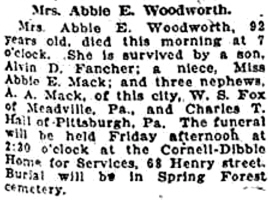Mrs. Abbie E. Woodworth, 92 years old, died this morning at 7 o'clock. She is survived by a son, Alvin D. Fancher; a niece, Miss Abbie E. Mack; and three nephews, A. A. Mack, of this city, W. S. Fox of Meadeville, Pa., and Charles T. Hall of Pittsburgh, Pa. The funeral will be held Friday afternoon at 2:20 o'clock at the Cornell-Dibble Home for Services, 68 Henry street. Burial will be in Spring Forest Cemetery.