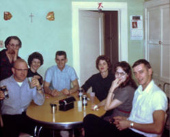 Card playing in 1964 at the Alice Abbey home - a winter sport! From left to right: Alice Abbey (behind Don); Don Wetzel (glasses); Marilyn (Abbey) Gustafson; Jim Abbey; Lenore (Abbey) Wetzel; Jan (Welk) Abbey; Alan Abbey. Photo courtesy of Kay Koslan.