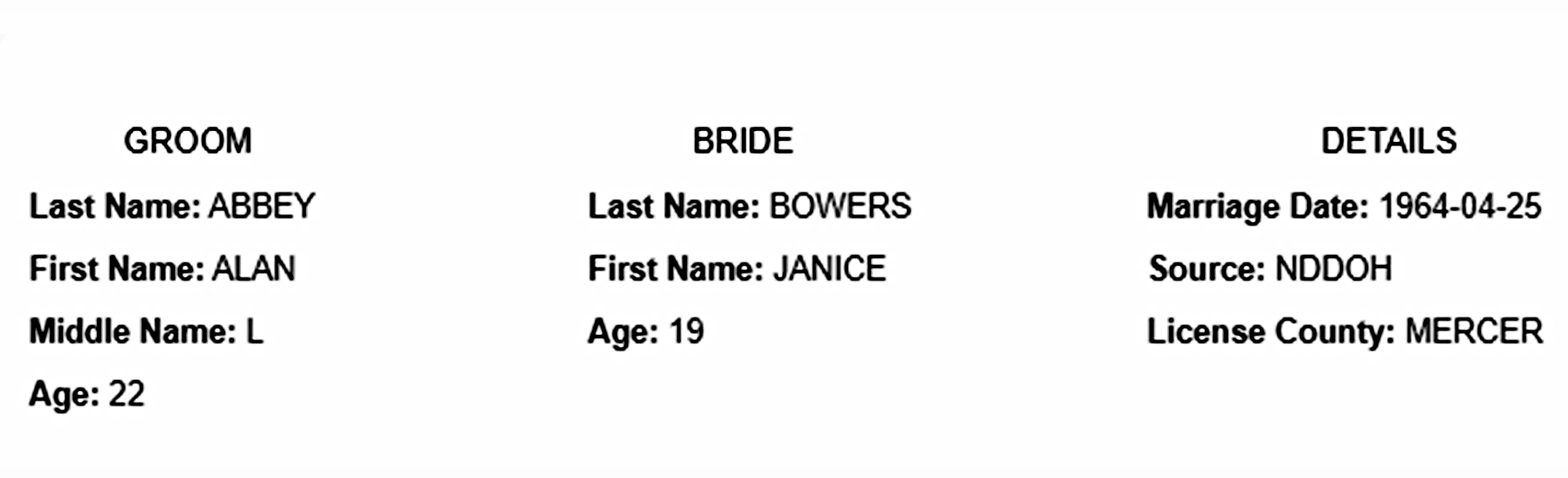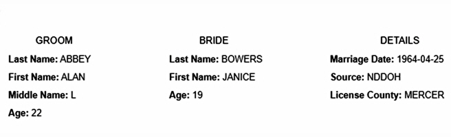 Alan Lee Abbey (age 22), a bachelor, and Janice Pearl "Jan" Bowers/Welk (age 19), a maiden, were married April 25, 1964, at St. Joseph Catholic Church, Beulah, Mercer Co., ND.