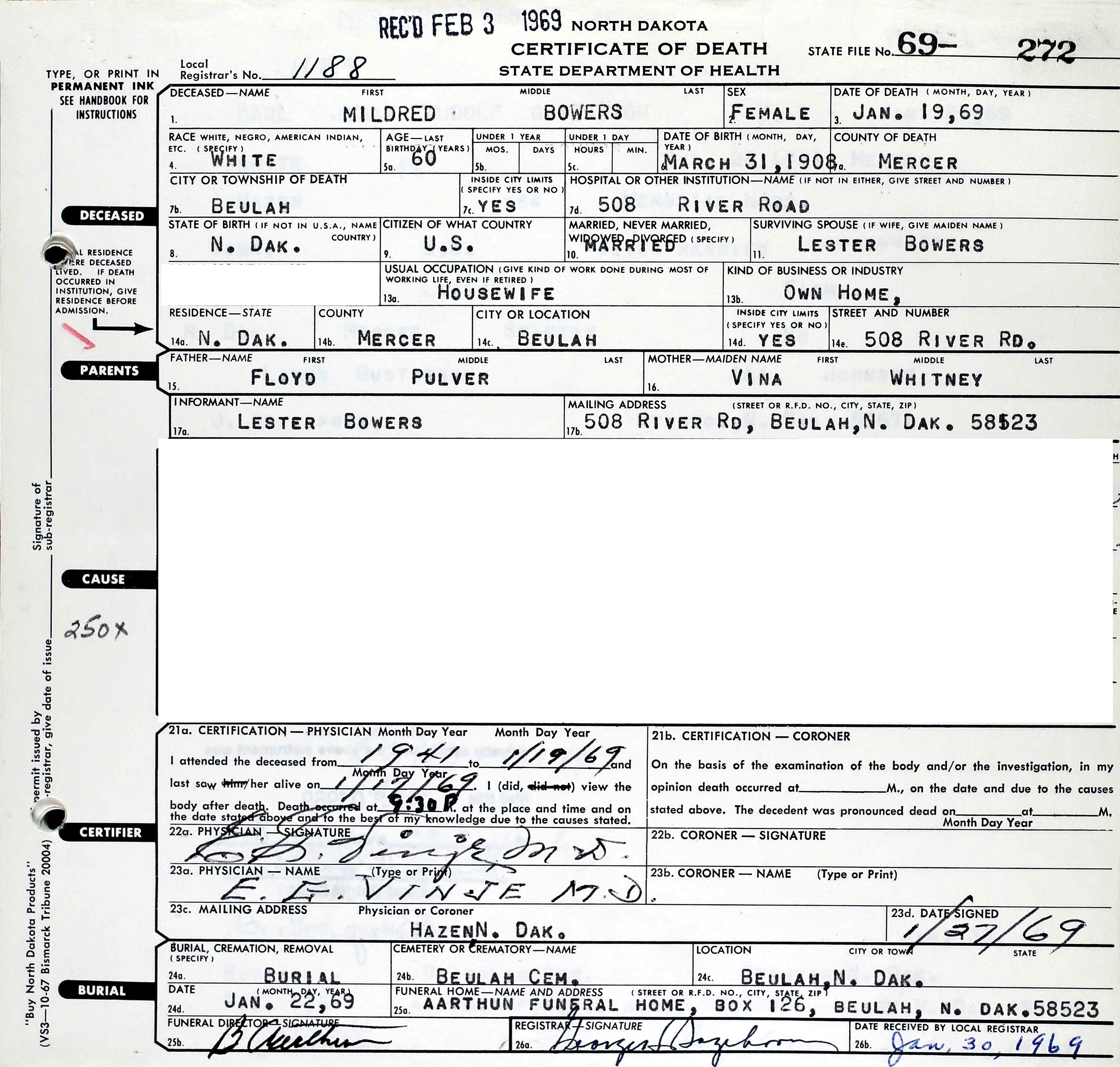 Mildred Pearl (Pulver) Bowers died January 19, 1969, in Beulah, Mercer Co., ND, at age 60. Buried in Beulah City Cemetery, Beulah, Mercer Co., ND.
