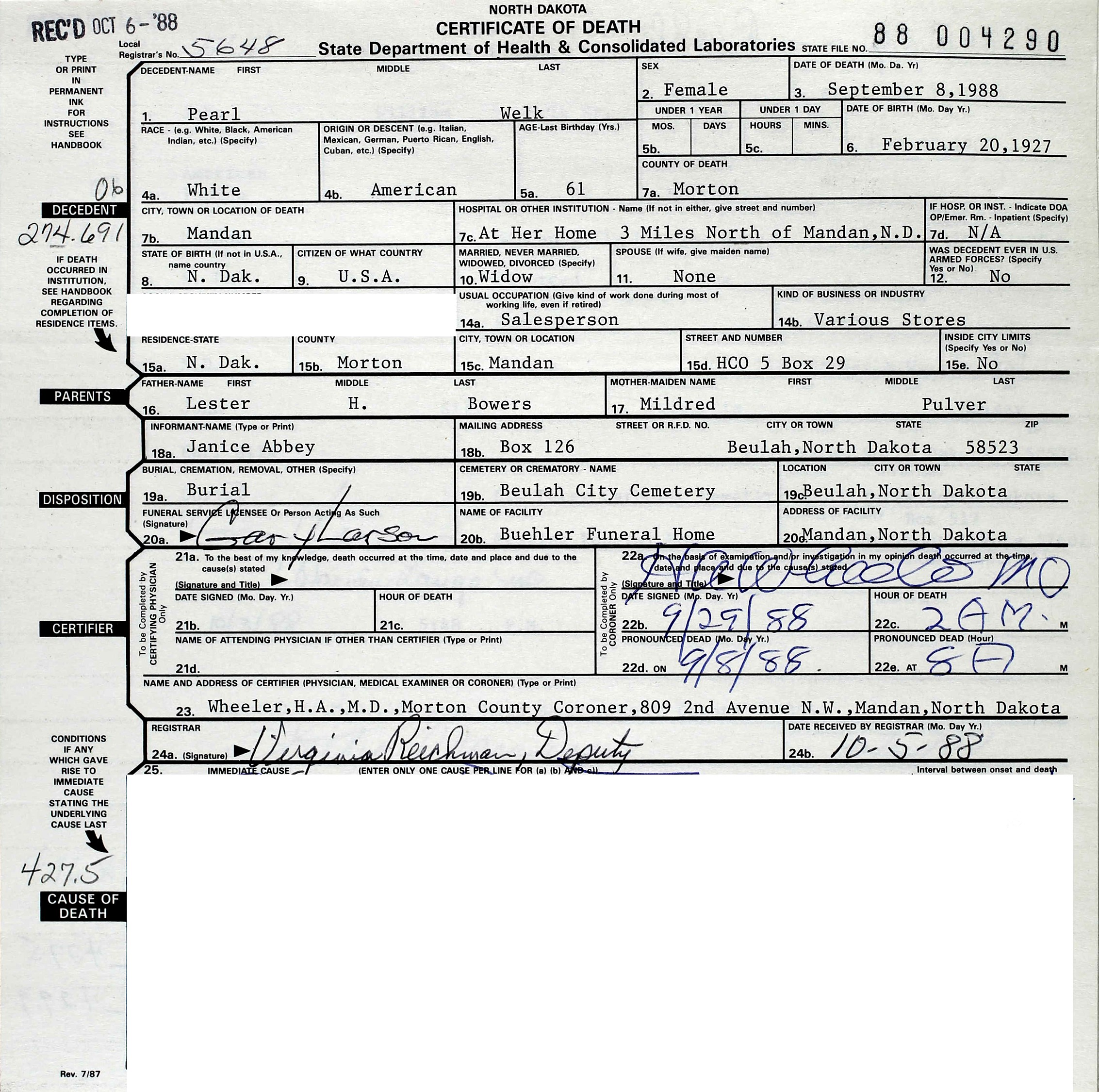 Pearl Alvira (Bowers) Welk died September 8, 1988, at her home, Mandan, Morton Co., ND, at age 61. Buried in Beulah Cemetery, Beulah, Mercer Co., ND.