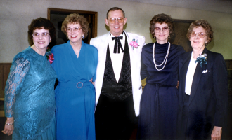 Left to Right: Jan (Welk) Abbey, Lois (Abbey) Lang, Alan Abbey, Marilyn (Abbey) Gustafson, and Lenore (Abbey) Wetzel, at Greg Abbey's wedding, October 11, 1996, Burleigh Co., ND . Photo courtesy of Kay Koslan.