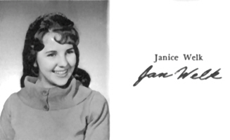 Janice Pearl "Jan" Welk attended Highland Park High School from 1960 to 1962, and graduated in 1962 from Highland Park High School, Highland Park, Lake Co., IL. Color photo courtesy of Kay Koslan .
