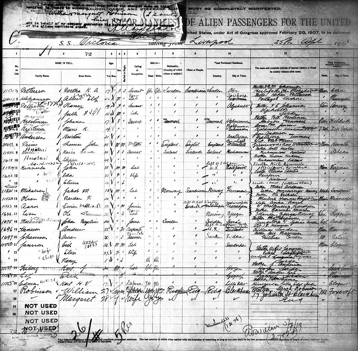 (age 22) an unmarried Farm Laborer, departed April 25, 1913, from Liverpool, England, aboard S. S. Victorian, with a final destination of Minneapolis, MN.Albert Elof Hakansson arrived May 7, 1913, at the Port of Quebec and Montreal, Canada, aboard S. S. Victorian, with a final destination of Minneapolis, MN.