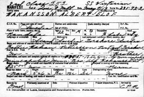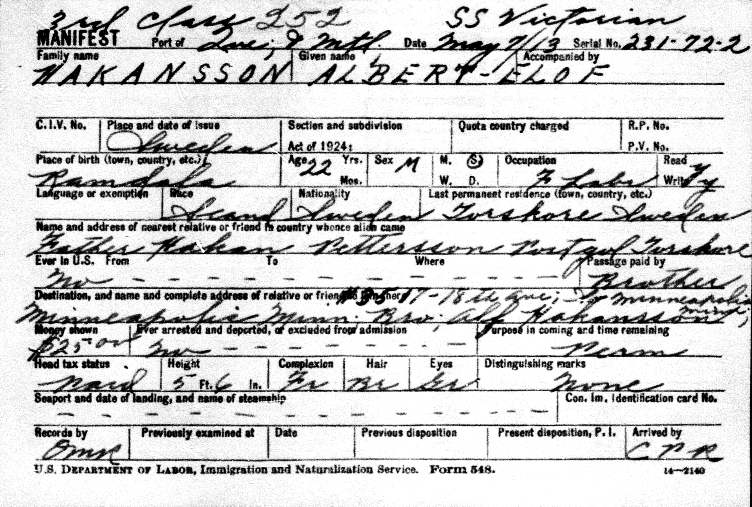 (age 22) an unmarried Farm Laborer, arrived May 7, 1913, at the Port of Quebec and Montreal, Canada, aboard S. S. Victorian, with a final destination of Minneapolis, MN. His brother Alfred Hakansson paid for his passage. He has $25 in cash.Albert Elof Håkansson changed his name to Albert Elof Hawkinson upon arriving in the United States.