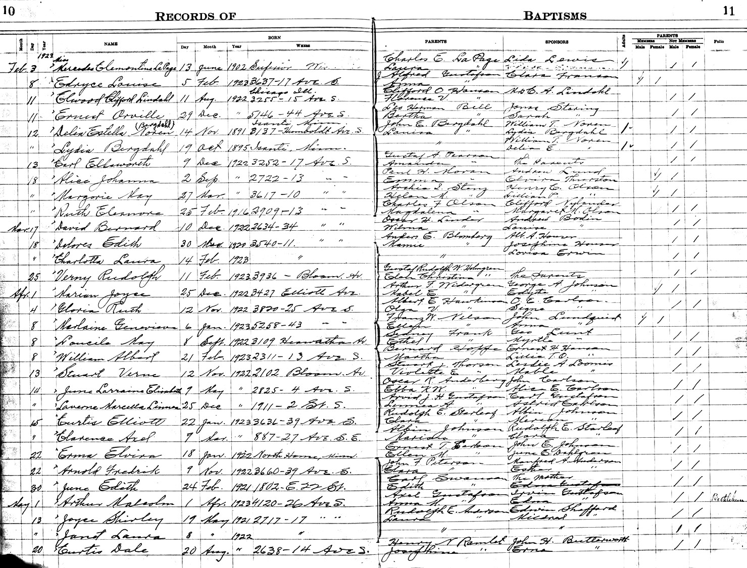 Delores Marie Hawkinson was baptized March 21, 1925, at St. Paul Church, Minneapolis, Hennepin Co., MN.