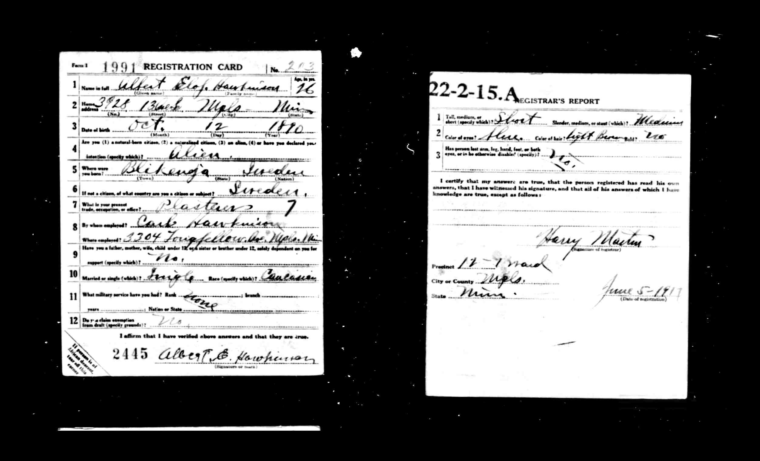 On June 5, 1917, the WWI Draft Registration Report shows Albert Elof Hawkinson is an alien and is living at 3928 13th Avenue South, Minneapolis, Hennepin Co., MN. He is an unmarried Plasterer working for Carl Hawkinson at 3304 Longfellow Ave.