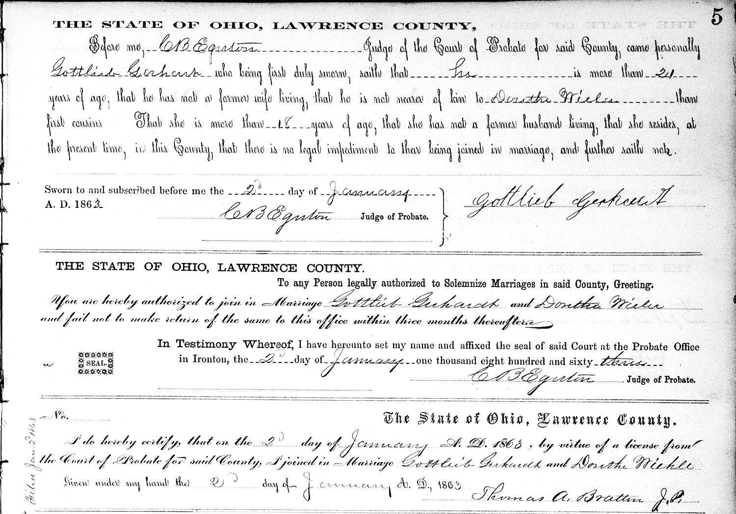 Johann Gottlieb Gerhardt, a widower, and Dorothea "Dora" ( Wiehle ) Gebauer, a widow, were married January 2, 1863, in Lawrence Co., OH.