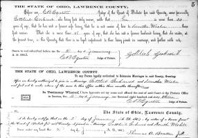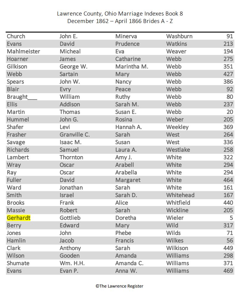 Johann Gottlieb Gerhardt and Dorothea "Dora" (Wiehle) Gebauer were married January 2, 1863, in Lawrence Co., OH. Marriage Index, Book 8, Page 5, December 1862 - April 1866