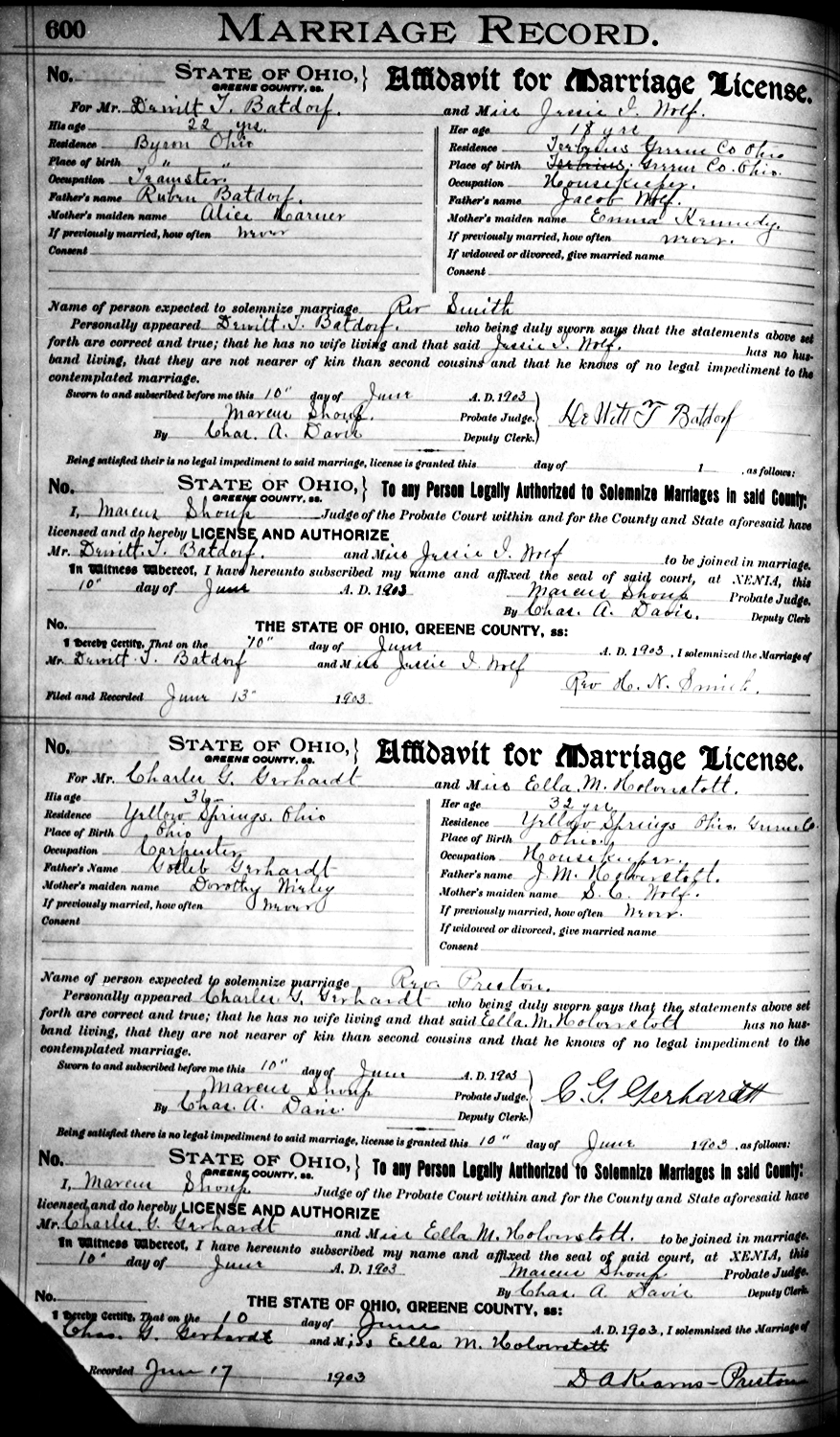 Charles George Gerhardt and Ella Mae Holverstott were m arried June 10, 1903, in Greene Co., OH.