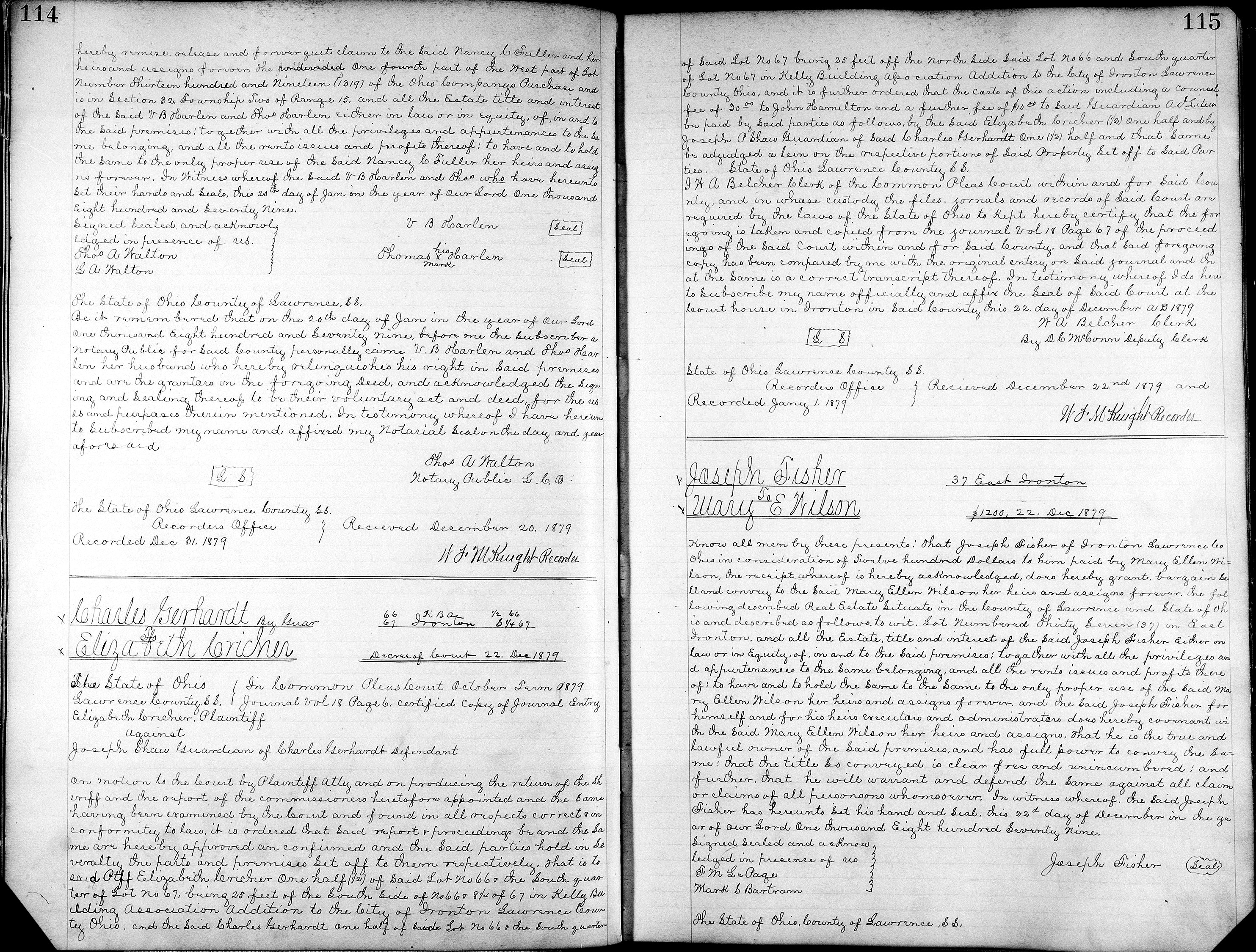 On December 22, 1879, Joseph P. Shaw, the Guardian for Charles George Gerhardt, sold the S 1/2 of Lot 66, and S 1/4 of Lot 67, in the Kelly Building Addition, Ironton, Lawrence Co., OH, to Elizabeth Cricher.