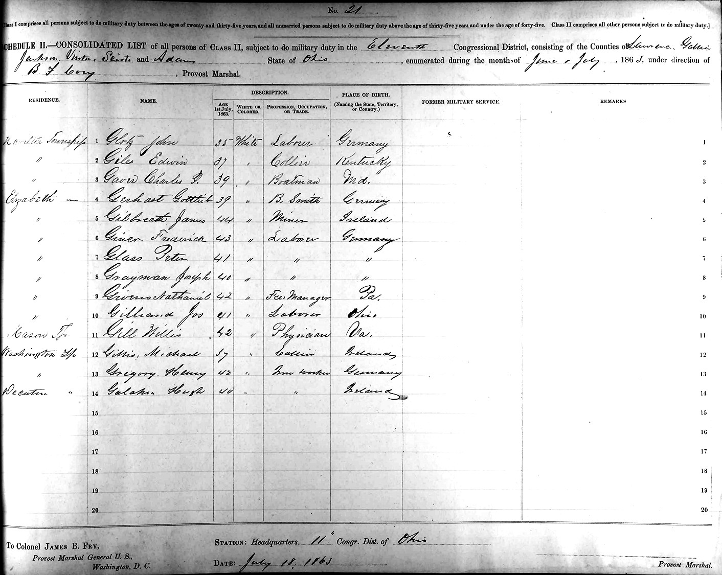 Gerhardt Jr., age 39, born in Germany, is a Blacksmith, and is living in Elizabeth Twp., Lawrence Co., OH.The Civil Ward Draft Record for Johann Gottlieb Gerhardt Jr.