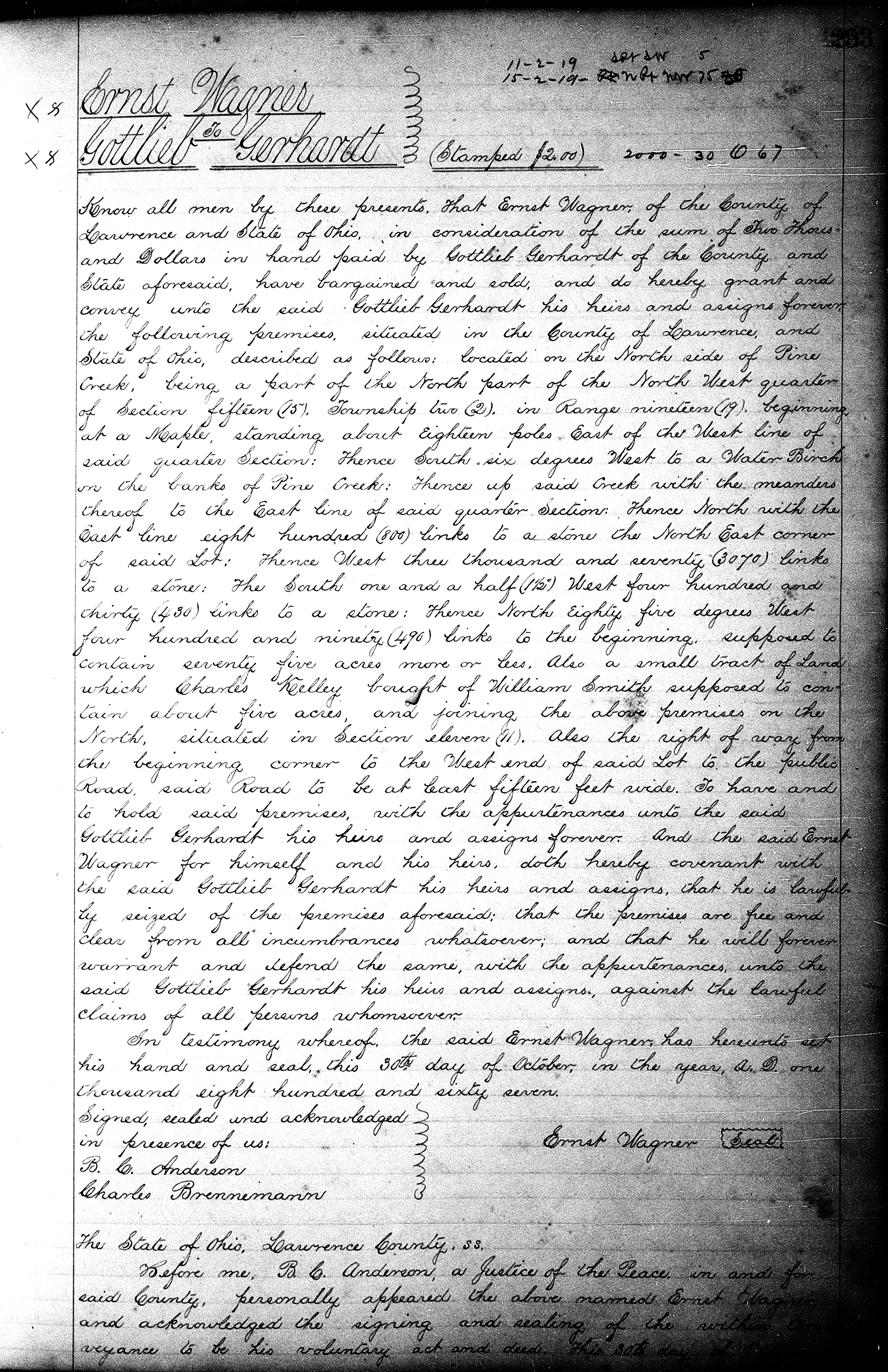 .Johann Gottlieb Gerhardt purchased land in Elizabeth Twp., Lawrence Co., OH, from Ernst Wagner for $2,000.00.