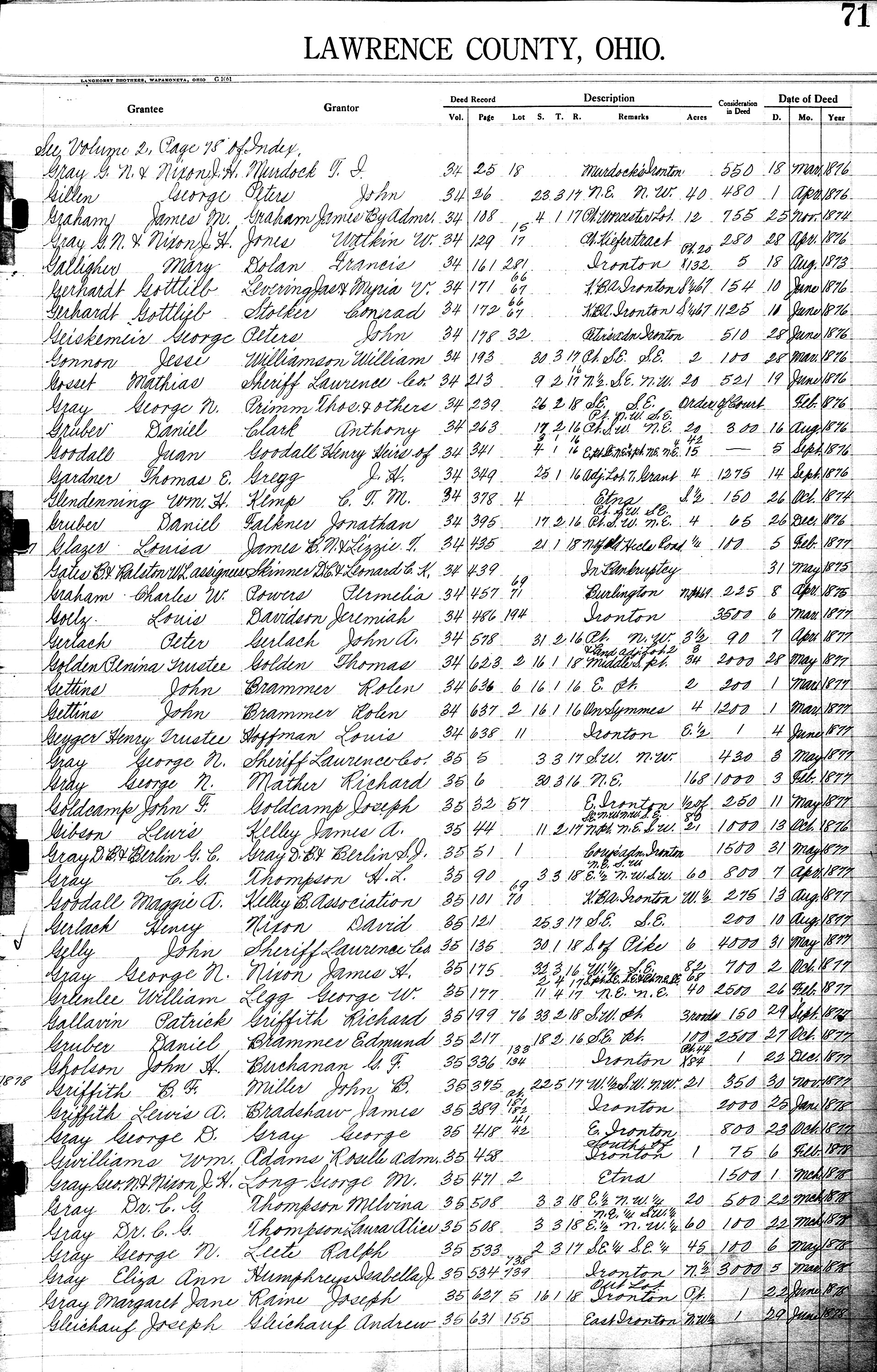 On June 10, 1876, Johann Gottlieb Gerhardt purchased Lots 66 and 67, in the Kelly Building Addition, Ironton, Lawrence Co., OH, S 1/4, Ironton, Lawrence Co., OH. One of the sellers were James and Myra V. Levering, and the other seller was Conrad Stolker.