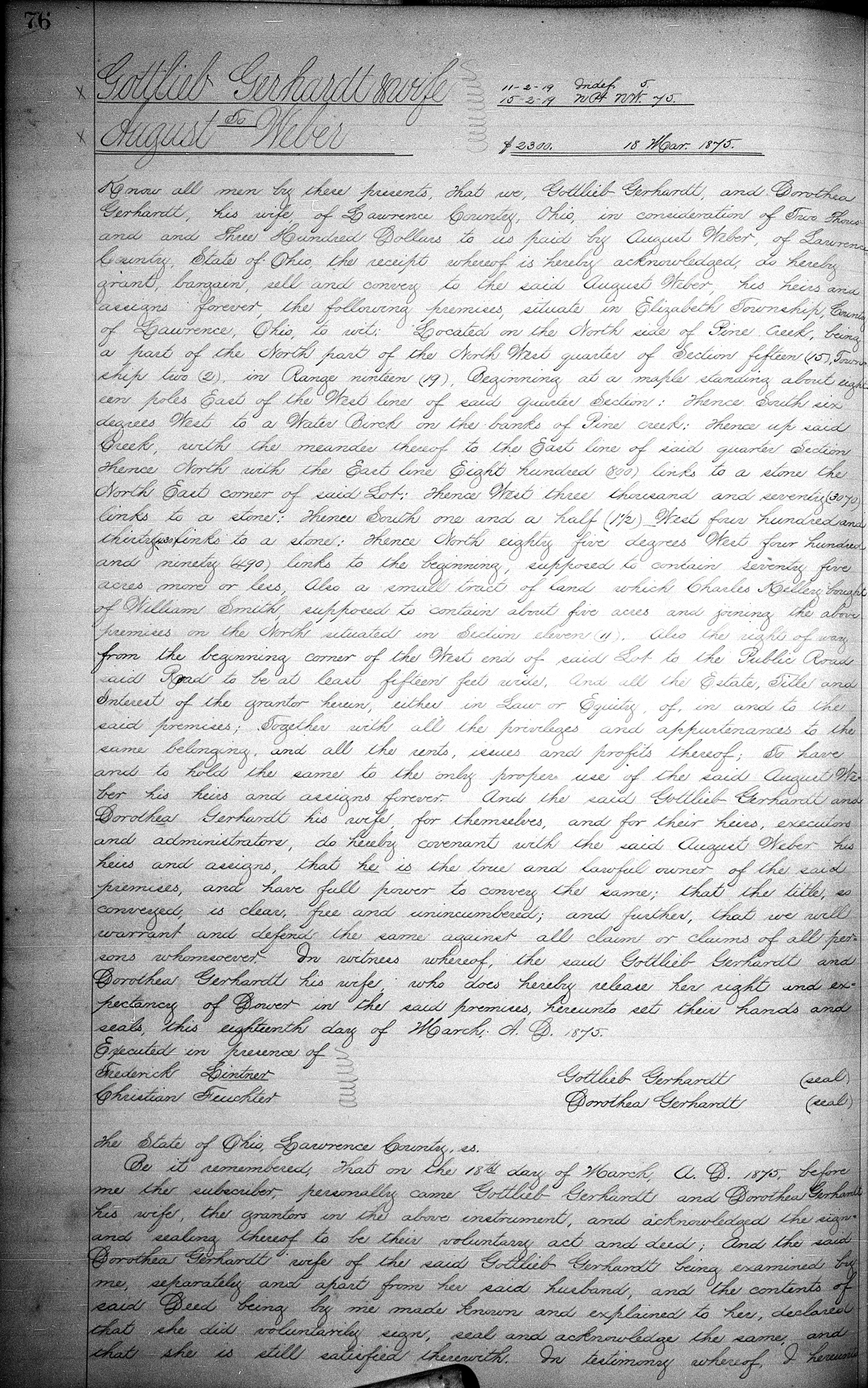 On March 18, 1875, Johann Gottlieb Gerhardt and Dorothea "Dora" (Wiehle) (Gebauer) Gerhardt sold their land in Elizabeth Twp., Lawrence Co., OH, to August Weber, for $1,867.00.
