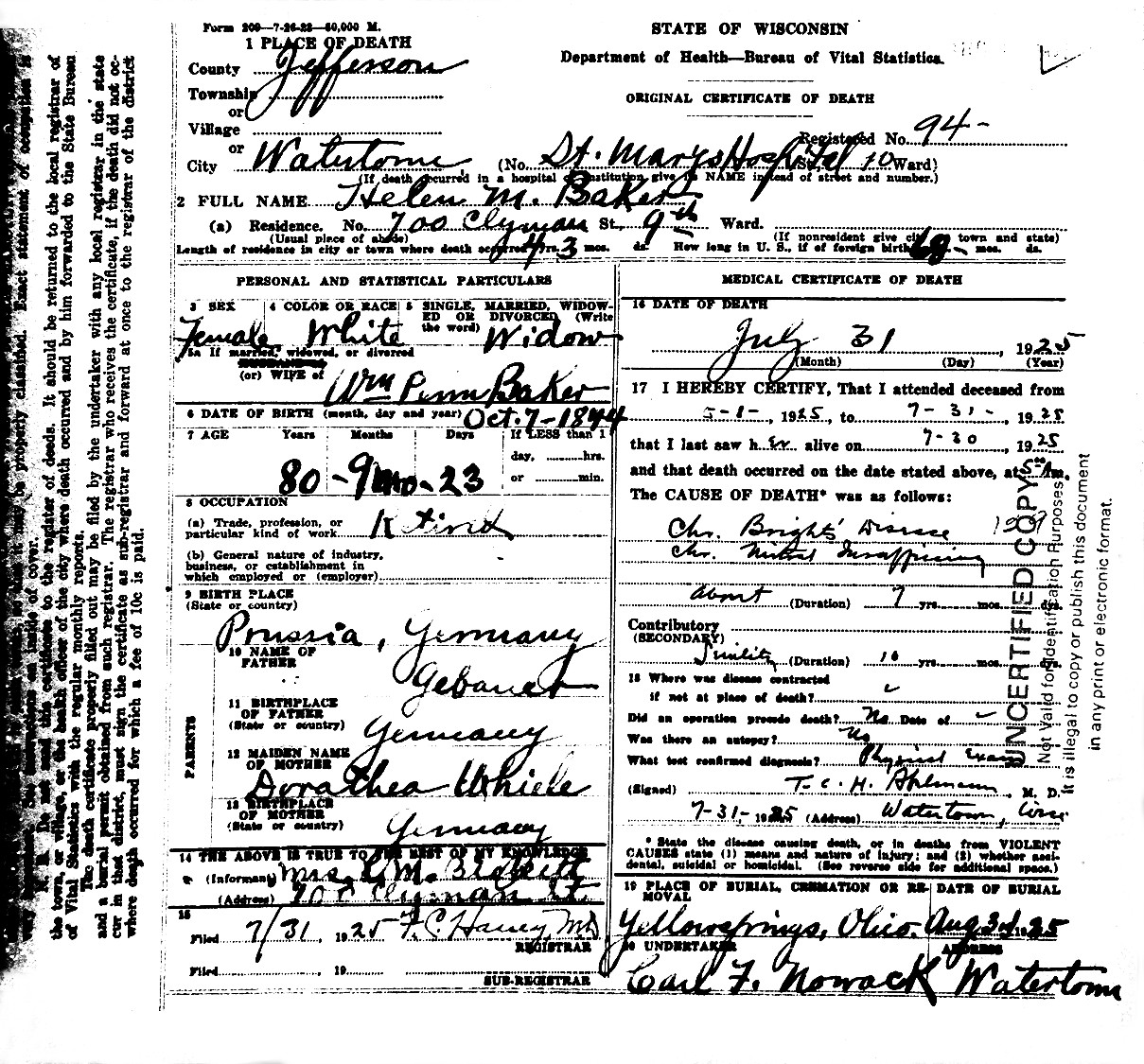 - Helen Margaret Gebauer : Born October 7, 1845, in Kreis, Ohlau, Silesia (Schlesien), Prussia, Germany; Died July 31, 1925, at Saint Mary's Hospital, Watertown, Jefferson Co., WI (age 79). Buried in Glen Forest Cemetery, Miami Twp., Greene Co., OH. Married May 20, 1874, at the William A. Means home, Village of Yellow Springs, Miami Twp., Greene Co., OH , to William Penn Baker: Born January 14, 1839, on a farm south of the Village of Yellow Springs, Miami Twp., Greene Co., OH; Died July 1, 1907, in the Village of Yellow Springs, Miami Twp., Greene Co., OH (age 67). Buried in Glen Forest Cemetery, Miami Twp., Greene Co., OH.
