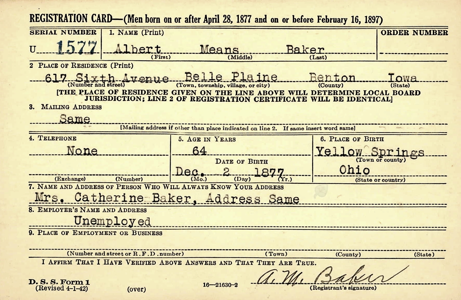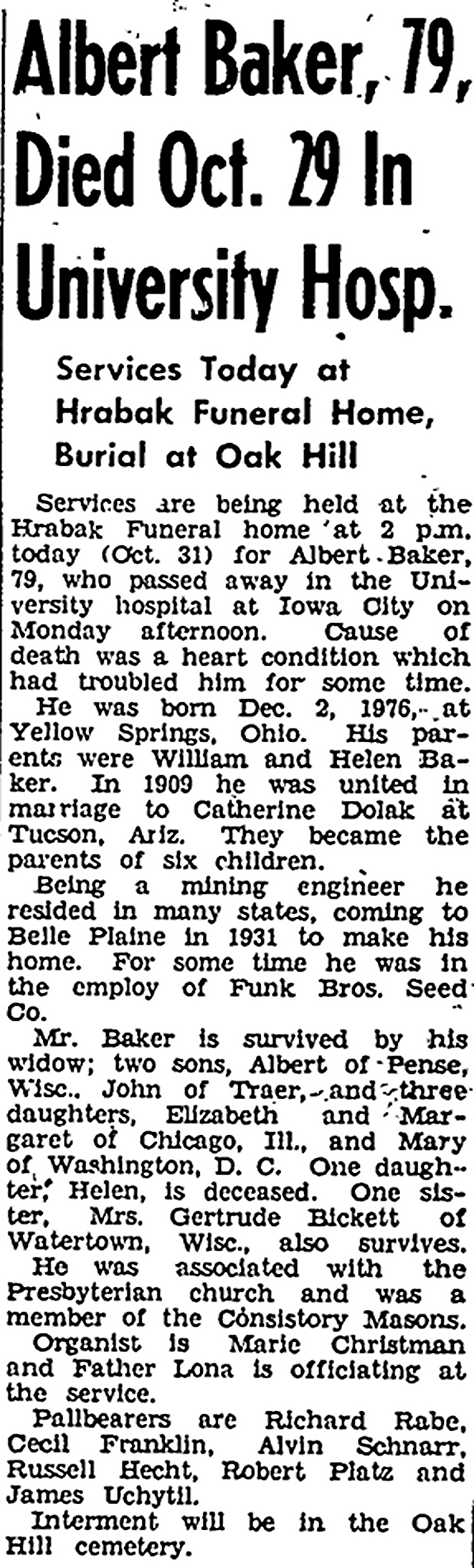 78. Buried in Oak Hill Cemetery, Belle Plaine, Benton Co., IA. He is the son of William Penn Baker of Yellow Springs, Greene