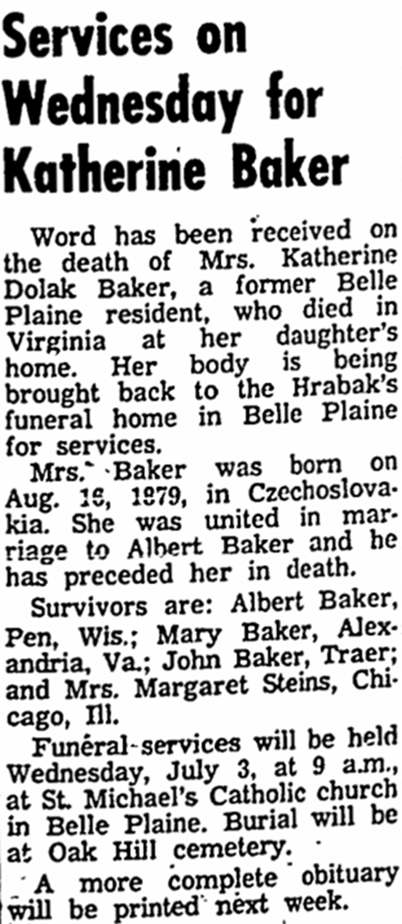 Mike Dolak died May 24, 1900, in Belle Plaine, Benton Co., IA.