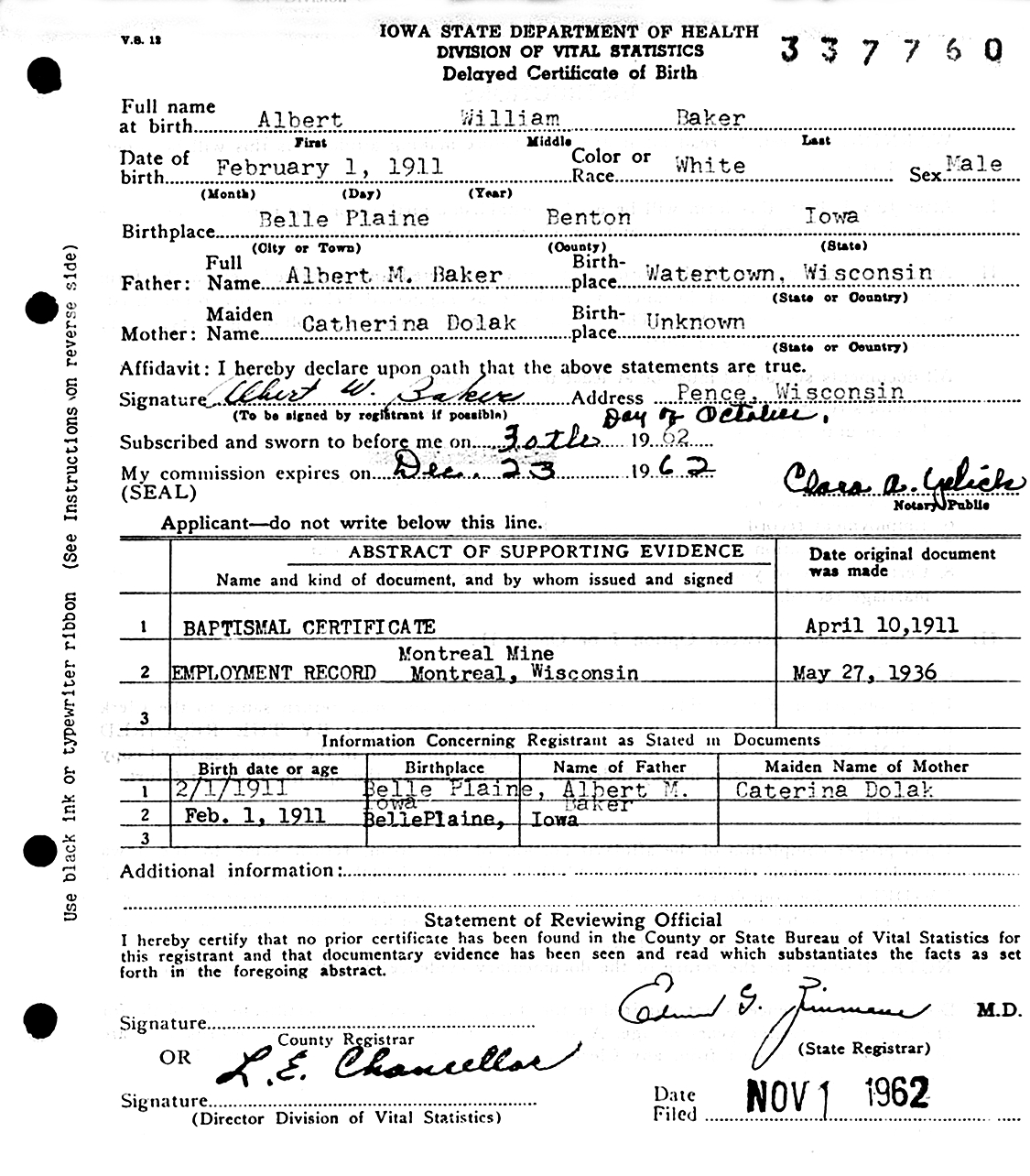 The Delayed Birth Record for Albert William Baker, dated October 30, 1962, in Pence, Montreal Twp., Iron Co., WI .
