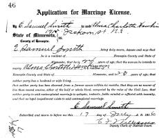 Erich Samuel Smith and Alma Charlotte Hawkinson were married July 17, 1916, in Minneapolis, Hennepin Co., MN.