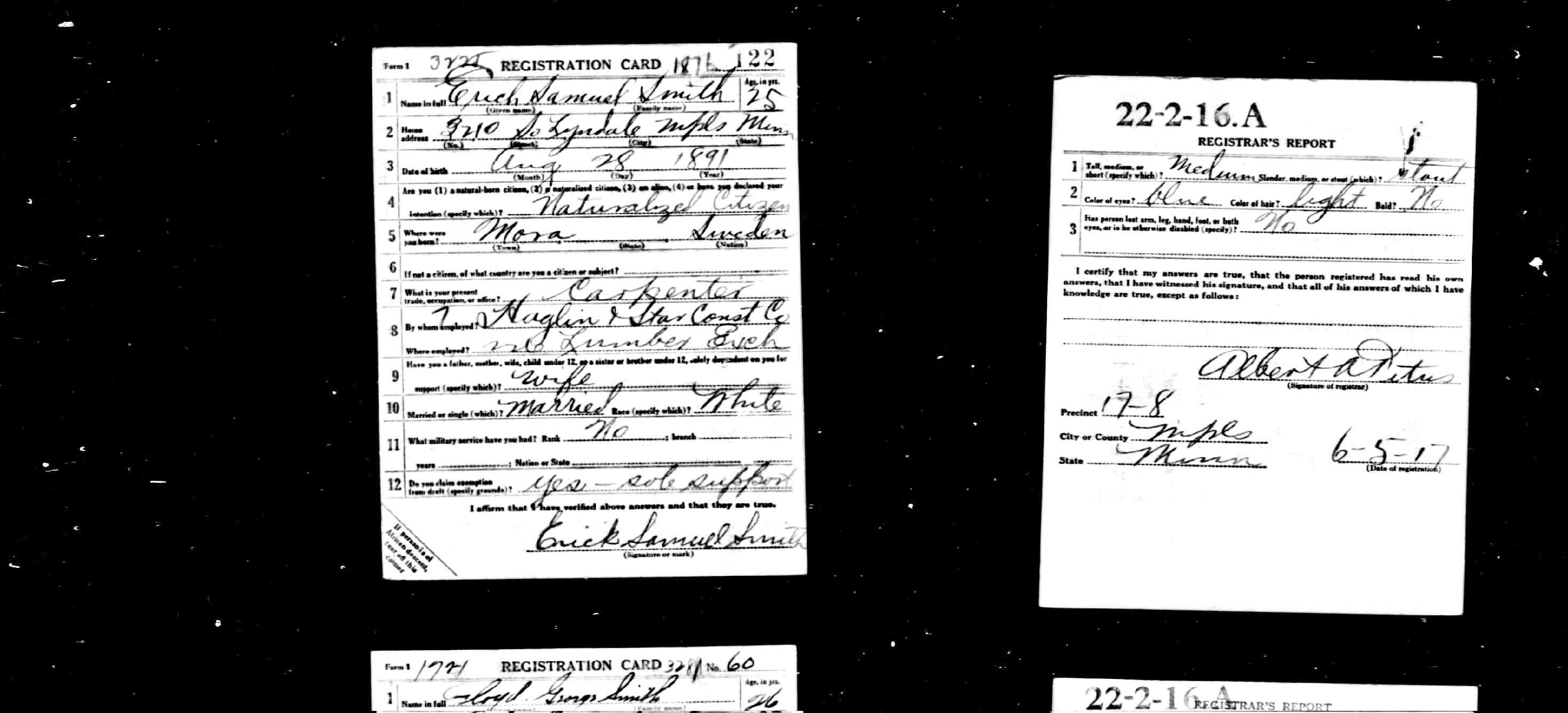 On June 5, 1917, the WWI Draft Registration Report shows Erich Samuel Smith is a Naturalized citizen living at 3210 S. Lyndale, Minneapolis, Hennepin Co., MN. He is a married Carpenter working for Haglin & Star Construction Co.