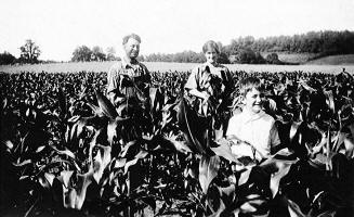 Almo, Emma and Wilbur Larson in their cornfield, Larson farm, Town of Farmington, Waupaca Co., WI , June 6, 1920.