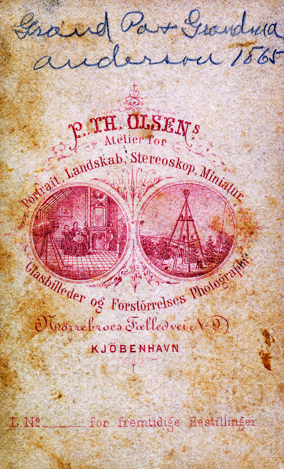 Christian Andersen and Johanne (Nelsen) Andersen, Copenhagen, Denmark, 1865. A remarkable example from the early days of photography. This "picture card" was in the photo album collection of Edythe "Eda" (Lewis) Lear, the daughter of Julianne Marie "Julia" (Andersen) Lewis. Please note that the eyes of both people were hand retouched with blue ink, an interesting way to add color in those days.