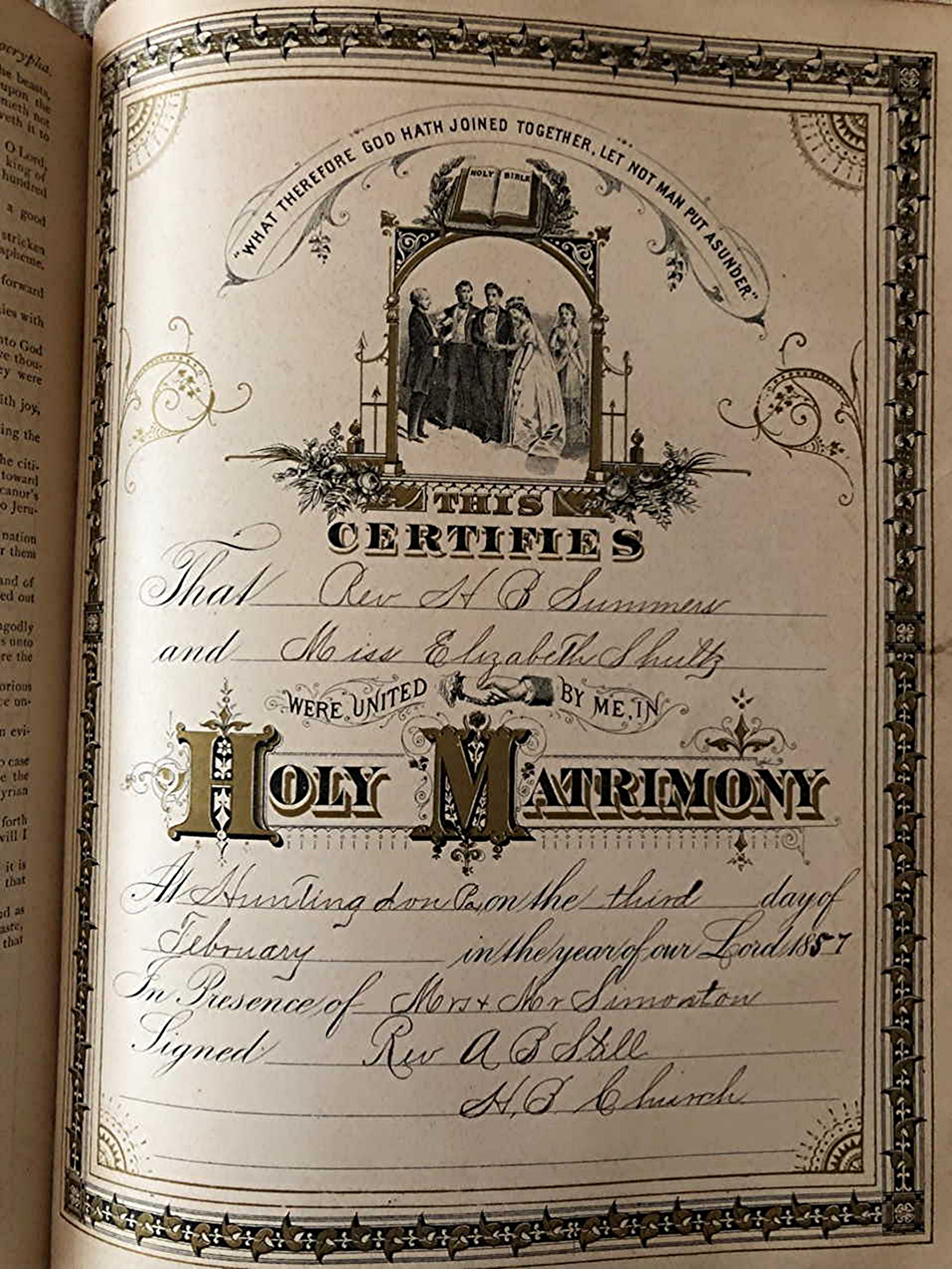 Henry Blake Summers and Elizabeth Schultz were married February 3, 1857, in Huntingdon, Huntingdon Co., PA.