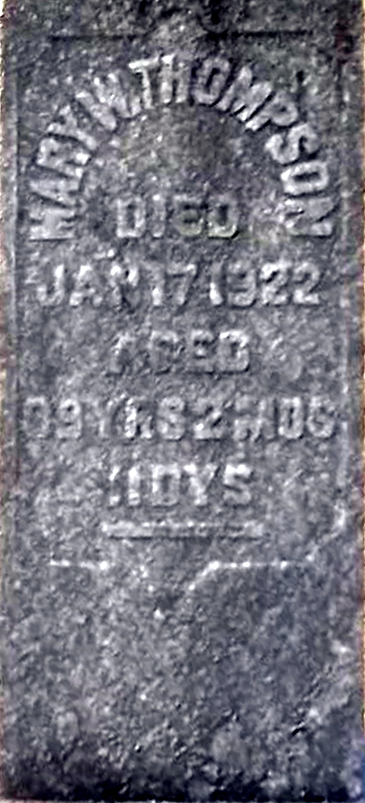 - Mary Wilson O'Donnell : Born October 6, 1833, in Pennsylvania; Died January 17, 1922, at her home, Templeton, Pine Twp., Armstrong Co., PA (age 89y, 2m and 11d). Buried in Tidal Union Cemetery, Tidal, Armstrong Co., PA. Married about 1849 to Robert Thompson: Born May, 1817, in Unknown; Died August 15, 1892, in Pennsylvania (age 75y, 2m and 16d). Buried in Tidal Union Cemetery, Tidal, Armstrong Co., PA. Lived in Pine Twp., Armstrong Co., PA.