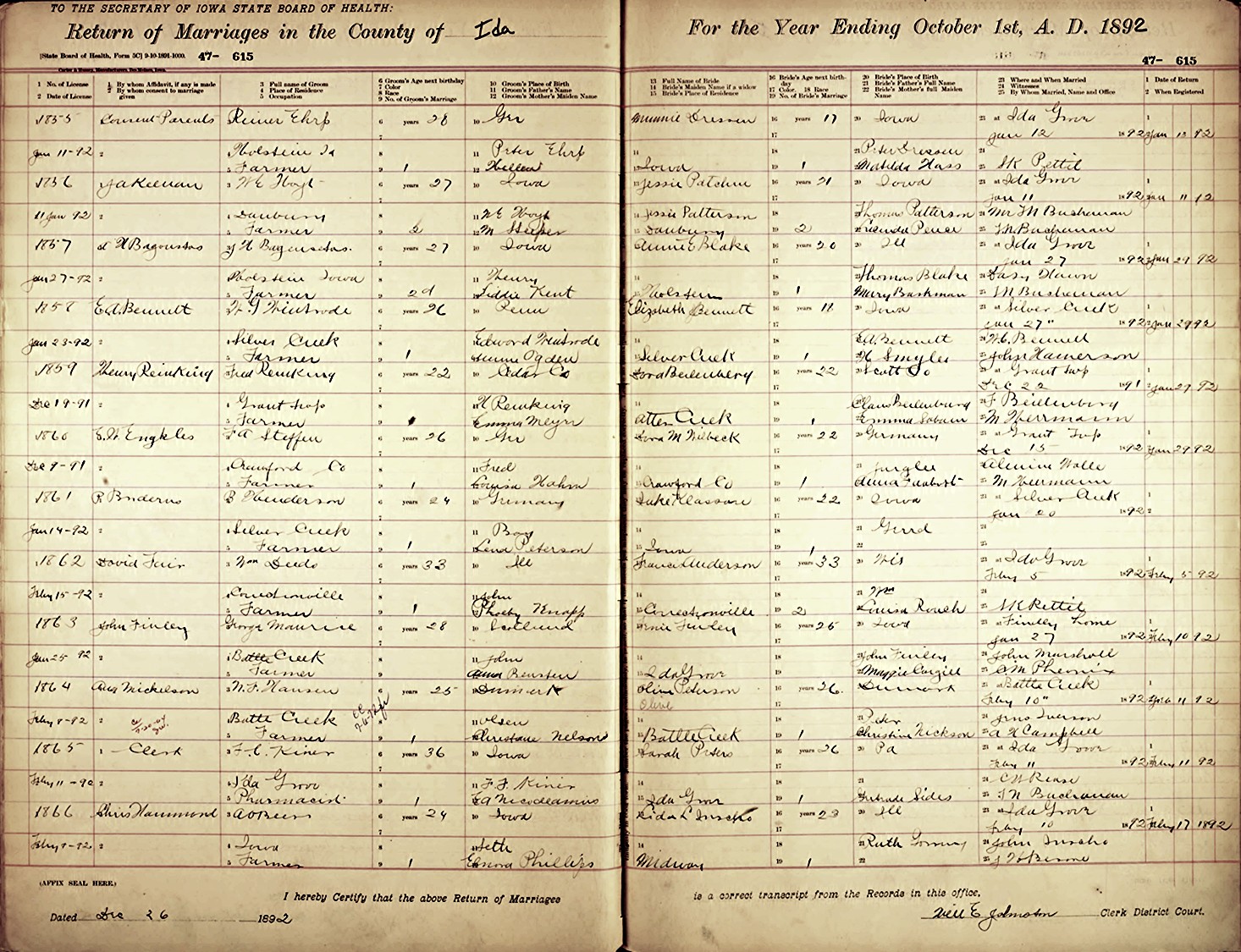Joseph Harrison Bagenstos and Anna Ethel "Annie" Blake were married January 27, 1892, in Ida Grove, Ida Co., IA.