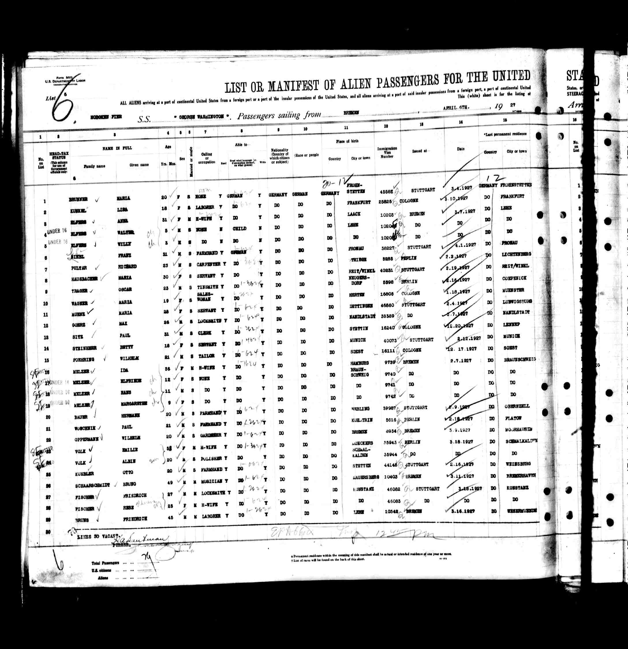 Max Goerz (age 26), an unmarried Locksmith, immigrated to the United States aboard the S. S. George Washington, departing Bremen, Germany on April 6, 1927, and arriving at the Port of New York on April 15, 1927. He was born in 1992. His last permanent address was in Nandlstadt, Germany.