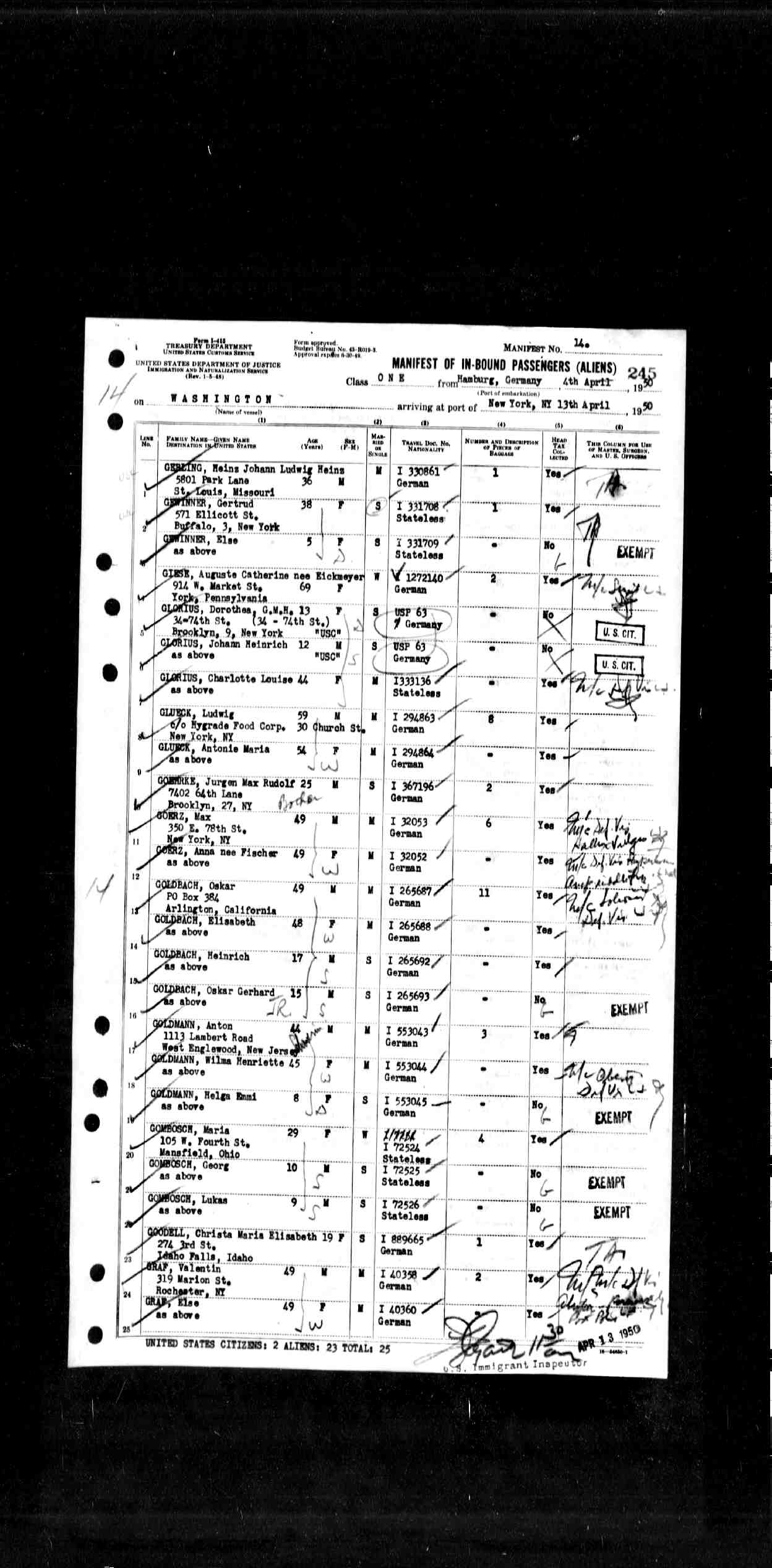 Max Goerz (age 49) and Anna (Fischer) Goerz (age 49) sailed aboard the S. S. Washington, departing Hamburg, Germany on April 4, 1950, and arriving at the Port of New York on April 13, 1950. They lived at 350 E. 78th Street, New York, NY.