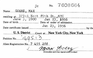 Maximilean "Max" Goerz was naturalized January 23, 1956, in New York City, NY.