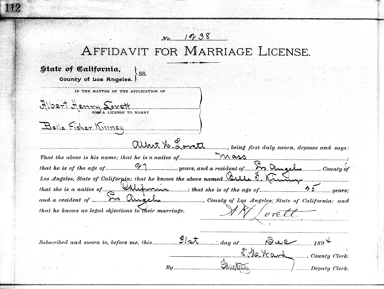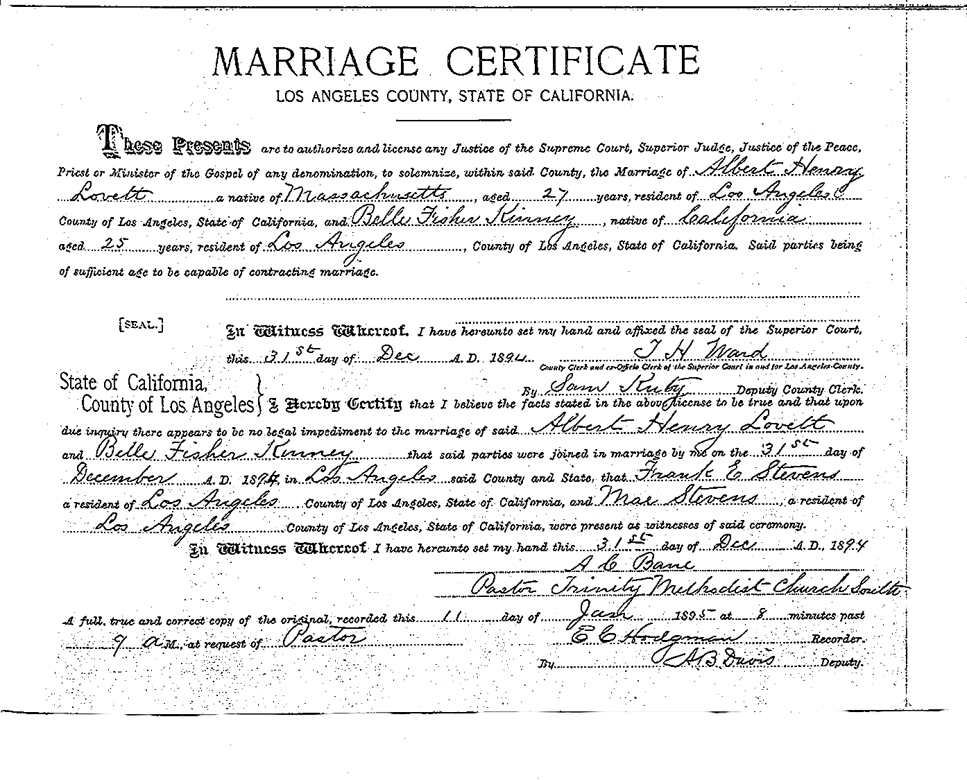 Albert Henry "Bert" Lovett, (age 22), a divorcee, and Arabella "Bella" (Fisher) Kinney (age 25), a divorcee, were married December 31, 1894, in Los Angeles Co., CA.