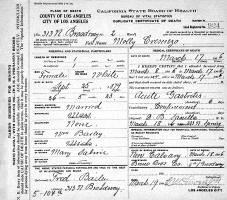 - Anna Ruth (a/k/a Mary Ruth) de Crescenzo: Born March 6, 1906, in Los Angeles, Los Angeles Co., CA; Died January 21, 1988, in Santa Monica, Los Angeles Co., CA (age 81). She is the daughter of Camillo Rudolph de Crescenzo of Solerno, Italy, and Mollie (Bailey) Levette of Massachusetts. Married September 8, 1924, at Santa Monica, Los Angeles Co., CA, to: Rocco Gagliardi: Born August 20, 1898, in Italy; Died October 22, 1955, in Los Angeles Co., CA (age 57). Mollie Bailey was born September 25, 1879, in Massachusetts, and died March 17, 1906, in Los Angeles, Los Angeles Co., CA (age 26). Buried in Calvary Cemetery, Los Angeles, Los Angeles Co., CA. Mollie's parents are William Bailey of Michigan, and Mary Sabine of Unknown.