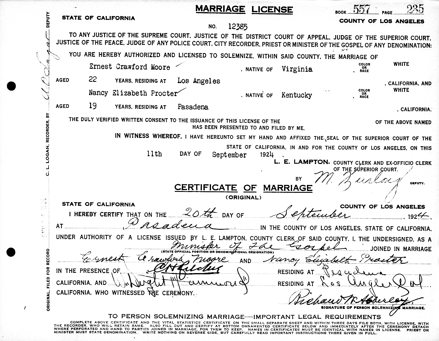 - Nancy Elizabeth "Betty" Proctor: Born about 1906 in Kentucky; Died Unknown. Married September 20, 1924, in Pasadena, Los Angeles Co., CA, to Ernest Crawford Moore: Born November 6, 1901, in Rockbridge Co., VA; Died January 17, 1938, in Santa Monica, Los Angeles Co., CA (age 26). Buried in Stonewall Jackson Memorial Cemetery, Lexington, KY.