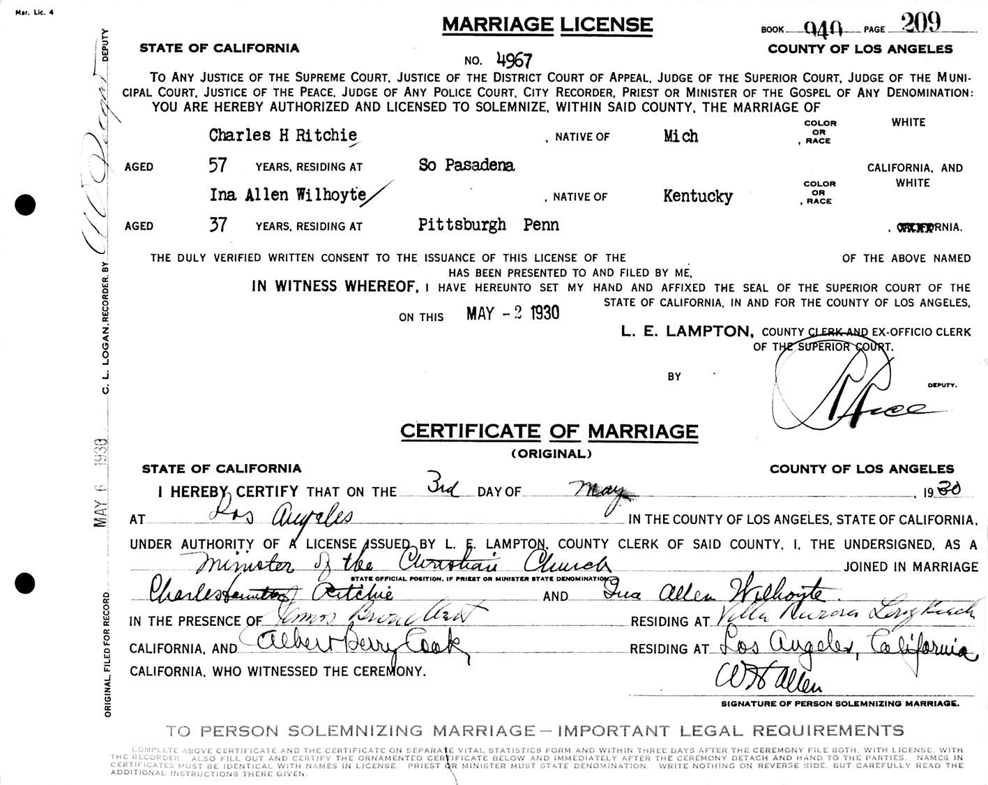 Charles Hamilton Ritchie and Ina Lillian (Allen) Wilhoyte were married May 3, 1930, in Santa Barbara, Los Angeles Co., CA.