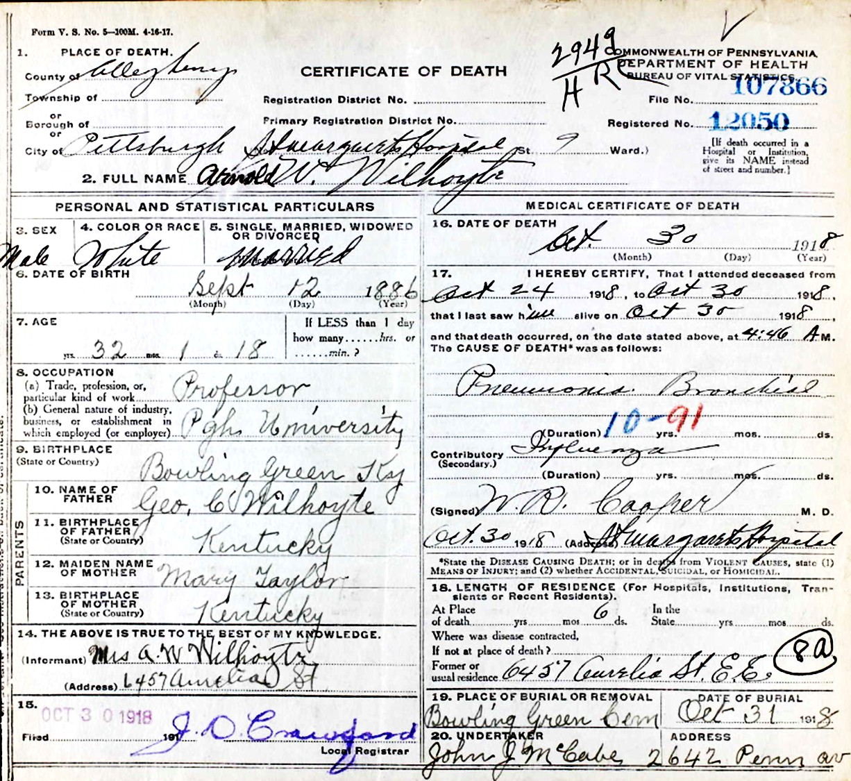 Arnold Weir Wilhoyte died October 30, 1918, in Pittsburgh, Allegheny Co., PA, at age 32.