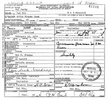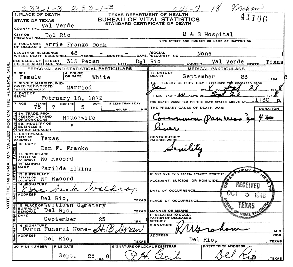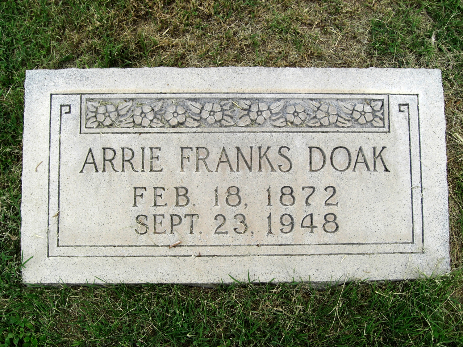 Arrie (Franks) Doak died September 23, 1948, at Medical & Surgical Clinic, Del Rio, Val Verde Co., TX , at age 76. Buried in Westlawn Cemetery, Del Rio, Val Verde Co., TX.
