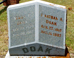 Jonathan A. Doak and Mary Elizabeth (Zumalt) Doak are buried in Pleasanton City Cemetery, Pleasanton, Atascosa Co., TX. Thanks to Find-A-Grave for making this photo available.