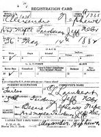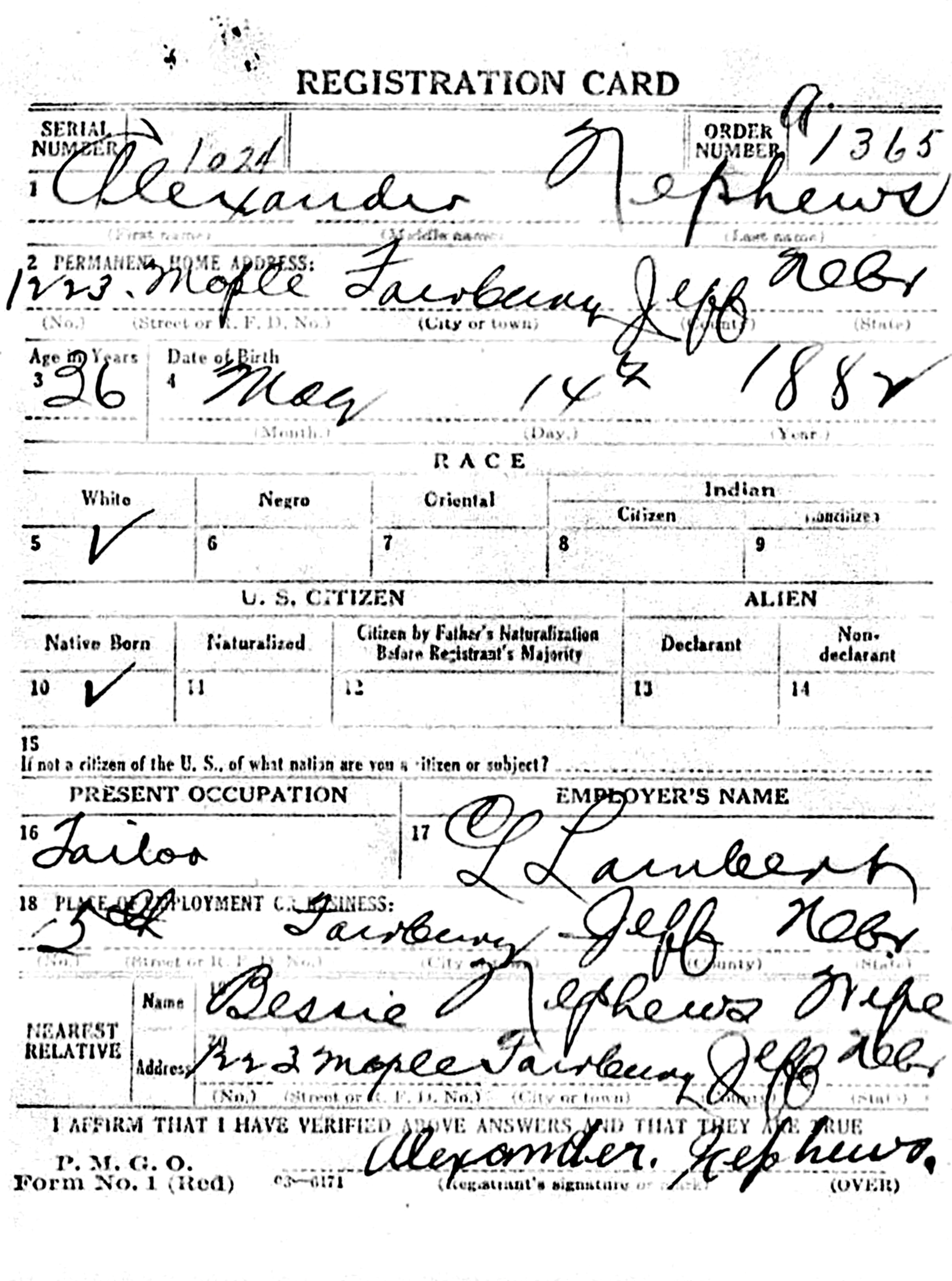 He is unmarried.The WWI Draft Registration Report dated September 18, 1918, shows Alexander Nephews (age 36) born May 14, 1882, is a Tailor working for L. Lambert and is living at 1223 Maple Street, Fairbury, Jefferson Co., NE. His nearest relative is his wife, Bessie Nephews, living at the same address.