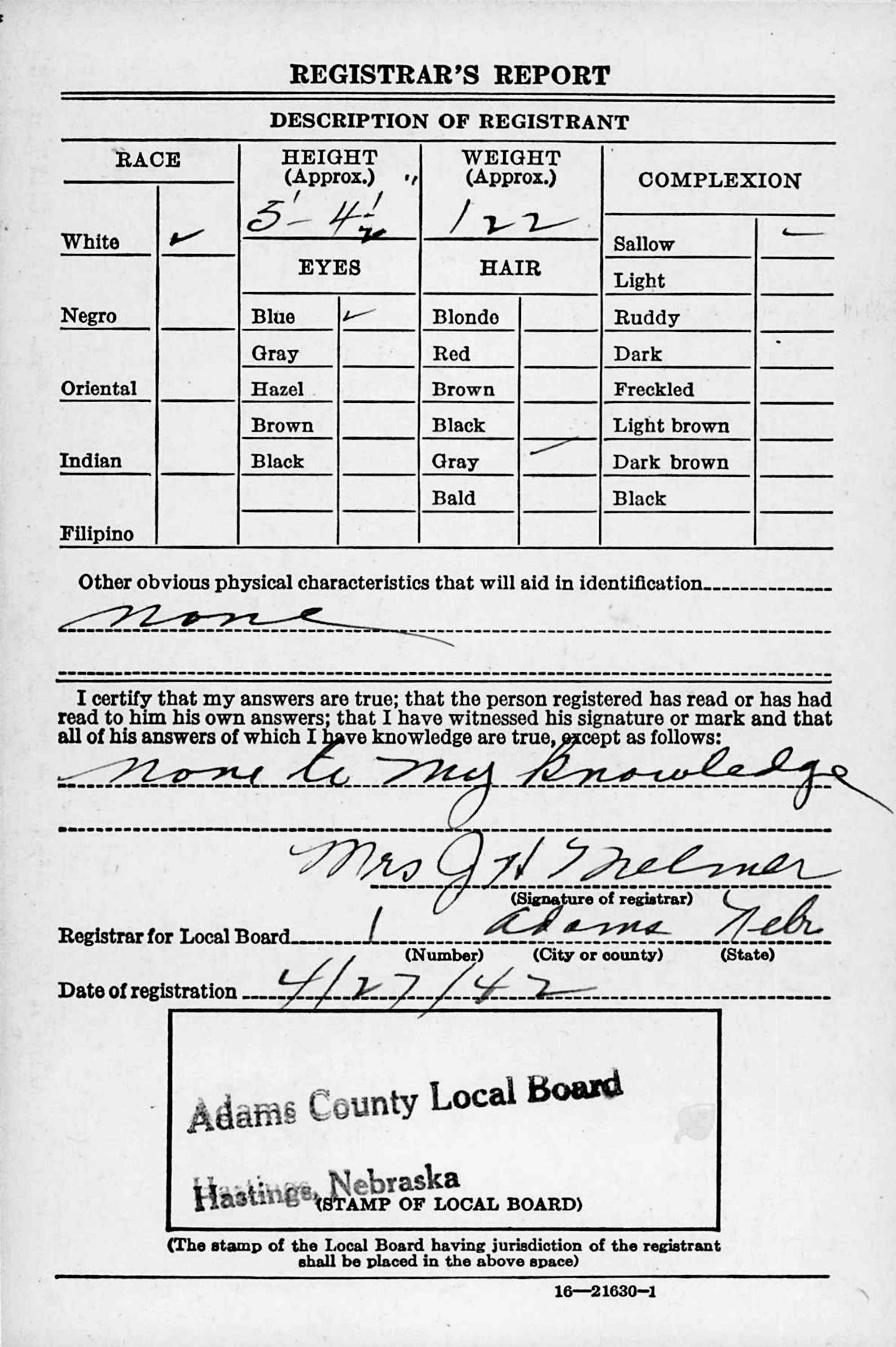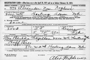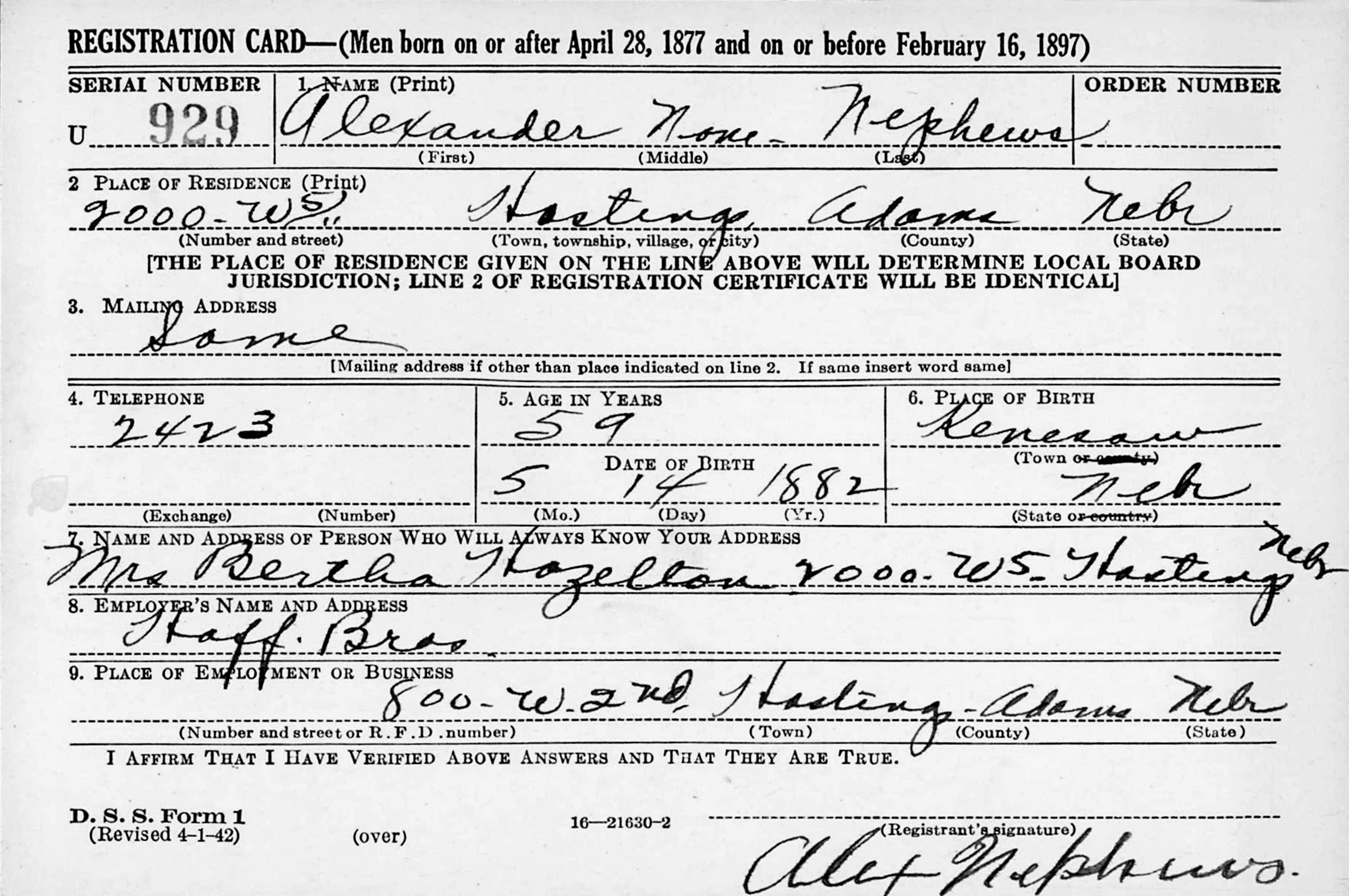 The WWII Draft Registration Report dated April 27, 1942, shows Alexander Nephews (age 59) born May 14, 1882, in Kenesaw, NE, is a Tailor working for Hoff Brothers, and is living at 2000 W. 2nd, Hastings, Adams Co., NE. The person who will always know his address is Mrs. Bertha Hazelton.