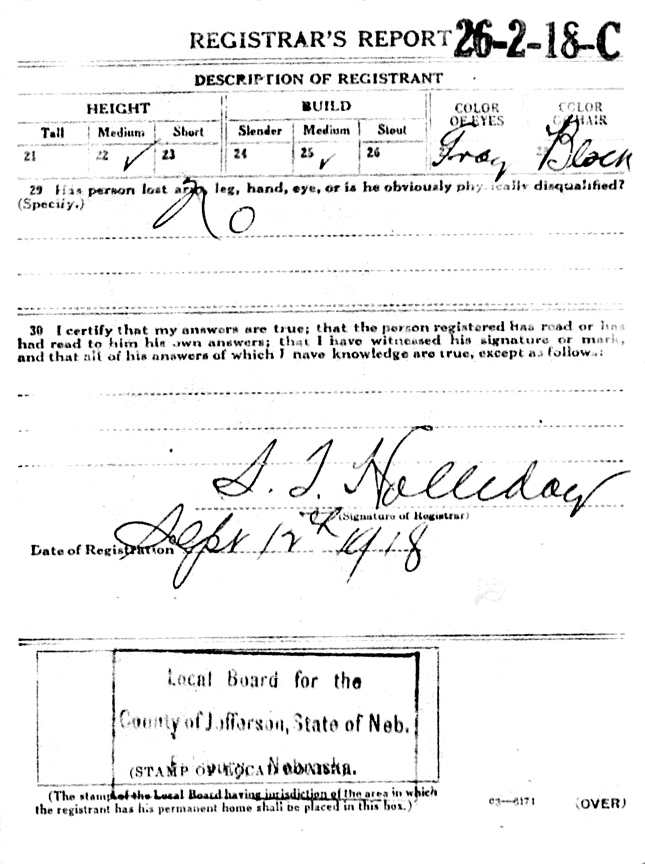The WWI Draft Registration Report dated June 5, 1917, shows Oliver Lawrence Babcock (age 22) born July 26, 1895, in Holenbery, KS, is a Painter, and is living at 926 B, Fairbury, Jefferson Co., NE.