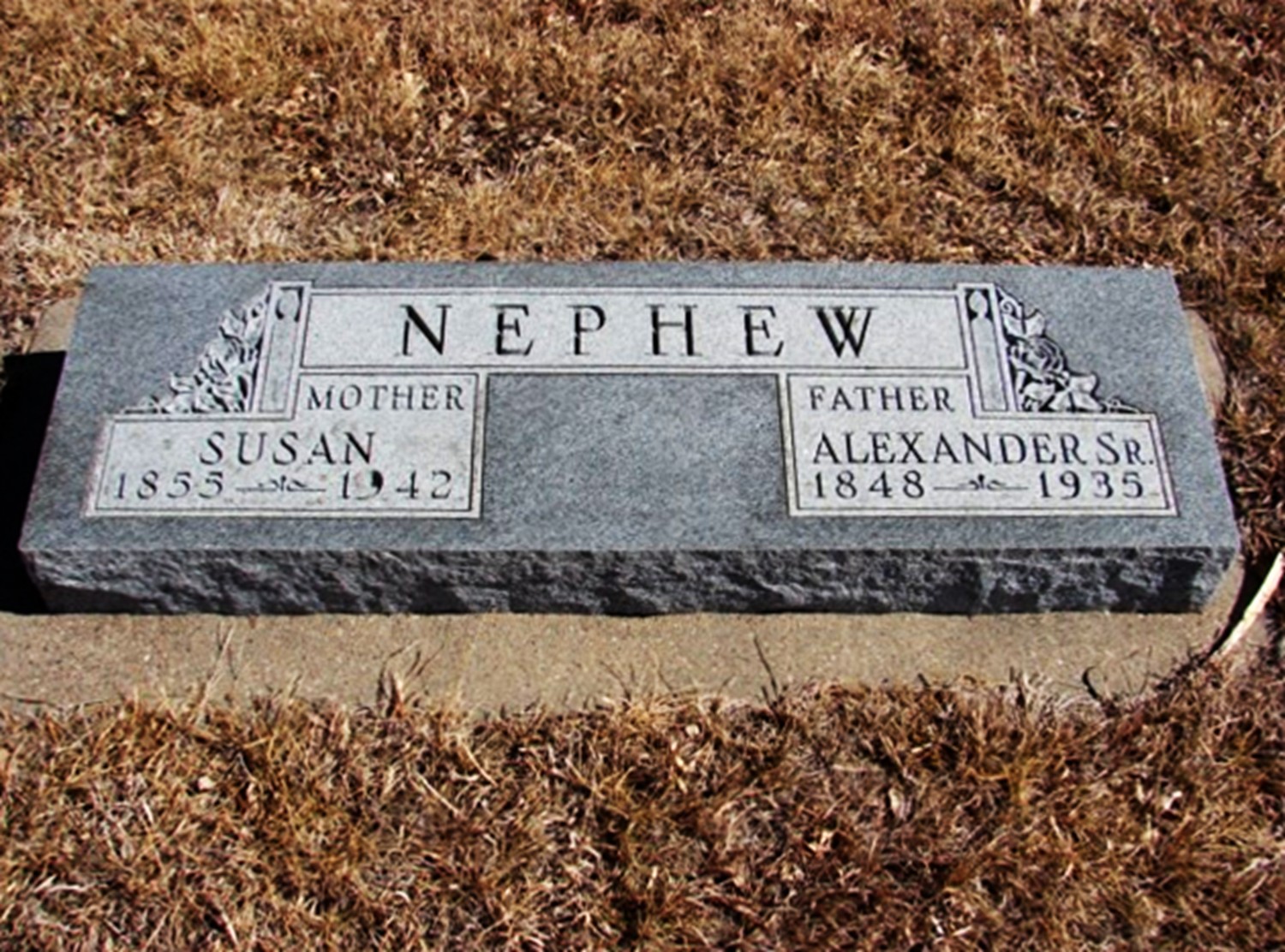 Alexander A. Nephew Sr. and Susan Ann (Brown) Nephew are buried in Kenesaw Cemetery, Wanda Twp., Adams Co., NE. Thanks to Donna Merkel of Nebraska for making this image available.