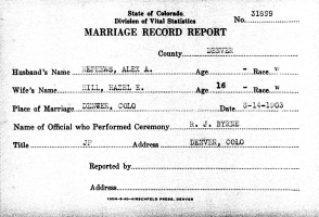 Alexander A. "Alex" Nephews Jr. (age 21), a bachelor, and Hazel E. Lapp Hill (age 16), a maiden, were married August 14, 1903, in Denver, Denver Co., CO.