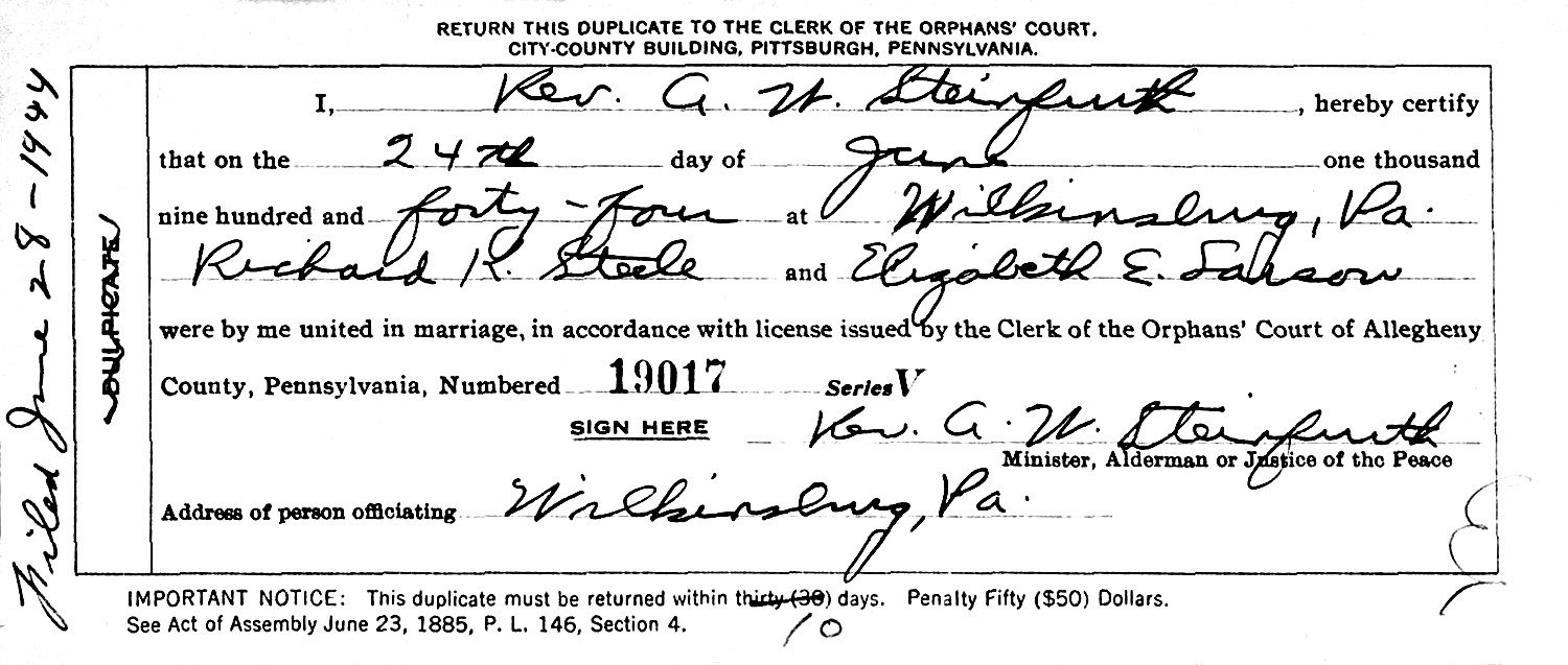 Steele (age 24), a bachelor, and Elizabeth Ellen "Betty" Larson (age