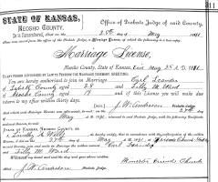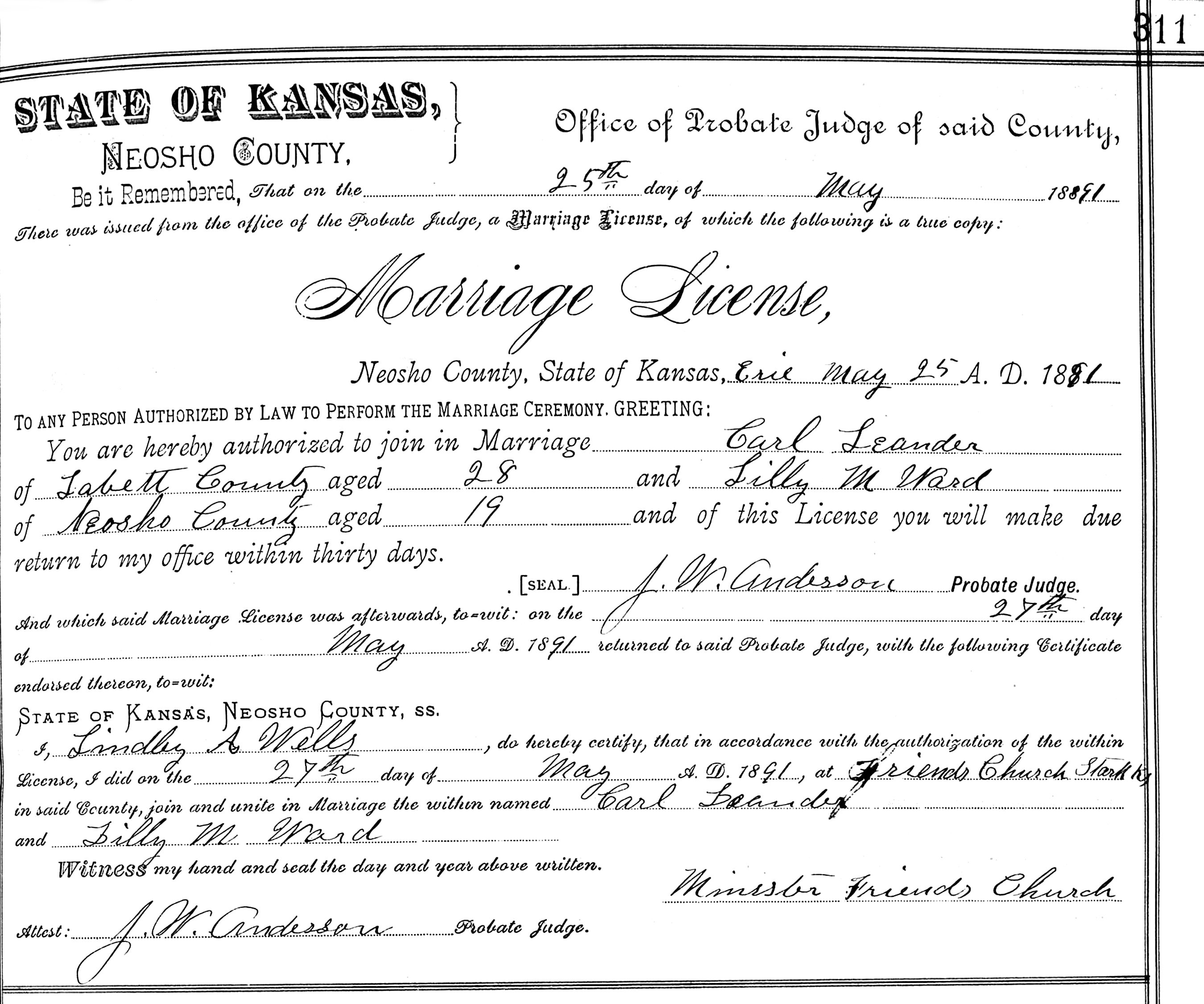 Carl E. Leander and Lilly Mae "Lillie" Ward were married May 27, 1891, at Friends Church, Stark, Neosho Co., KS.